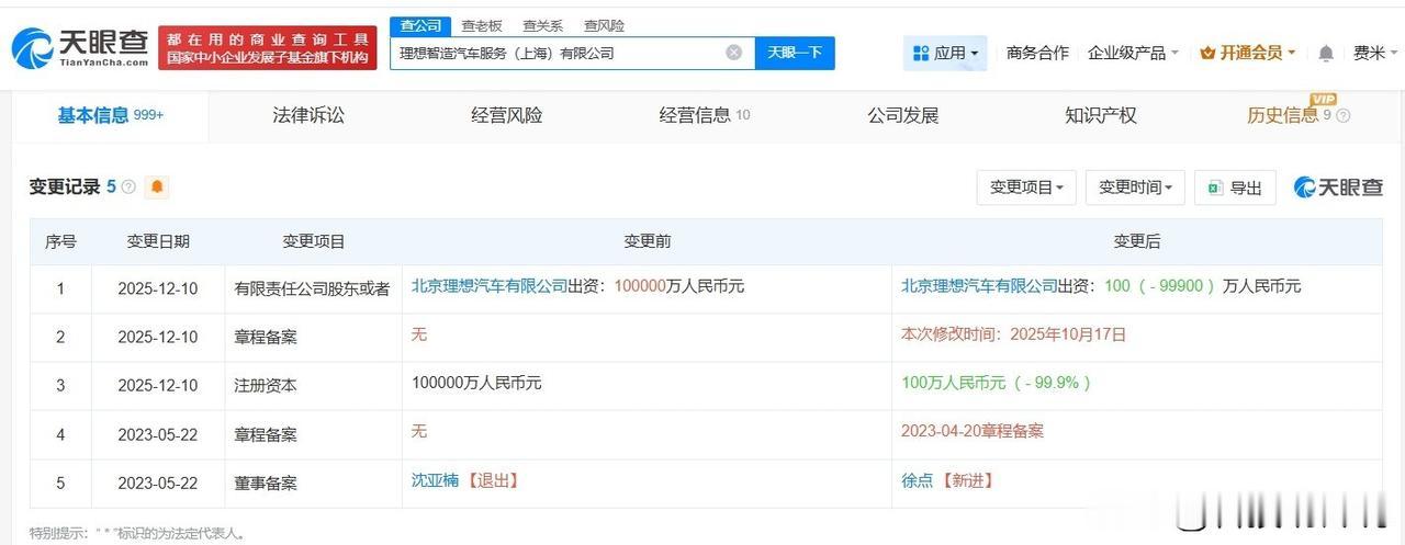 【理想汽车旗下多家公司近期接连减资 理想汽车旗下智造服务公司减资99.9%】 天眼查App显示,近日,理想智造汽车服务(上海)有限公司发生工商变更,注册资本由10亿人民币减至100万人民币,降幅99.9%, 该公司成立于2022年9月,法定代表人为刘杰,经营范围包括小微型客车租赁经营服务、信息咨询服务、会议及展览服务、机动车修理和维护等,由北京理想汽车有限公司全资持股。值得一提的是,近期,理想汽车旗下北京励鼎汽车销售有限公司、北京罗克维尔斯科技有限公司均发生减资行为。 天眼查信息: