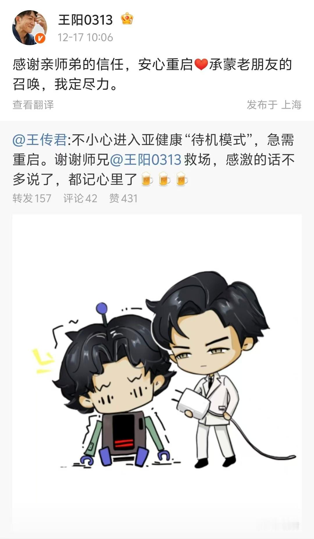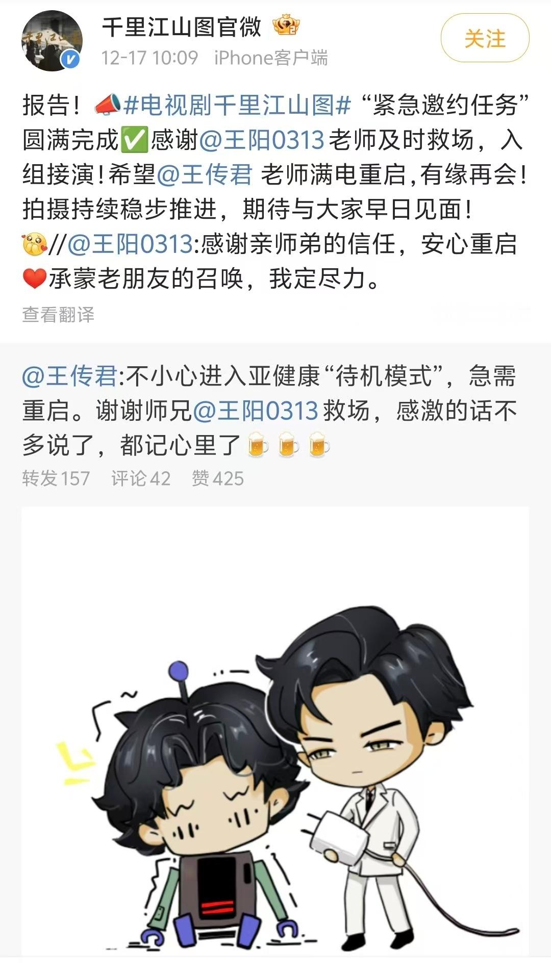 【王传君因病退出千里江山图拍摄】王阳接替王传君拍千里江山图 12月17日,发文称:“不小心进入亚健康‘待机模式’,急需重启。谢谢师兄救场,感激的话不多说了,都记心里了。”王阳转发称:“感谢亲师弟的信任,安心重启。承蒙老朋友的召唤,我定尽力。”《千里江山图》剧组官微表示,“紧急邀约任务”圆满完成,感谢王阳及时救场,入组接演!拍摄持续稳步推进,期待与大家早日见面。据了解,《千里江山图》由汪俊执导,等出演,陈道明监制并友情出演,你期待吗?
