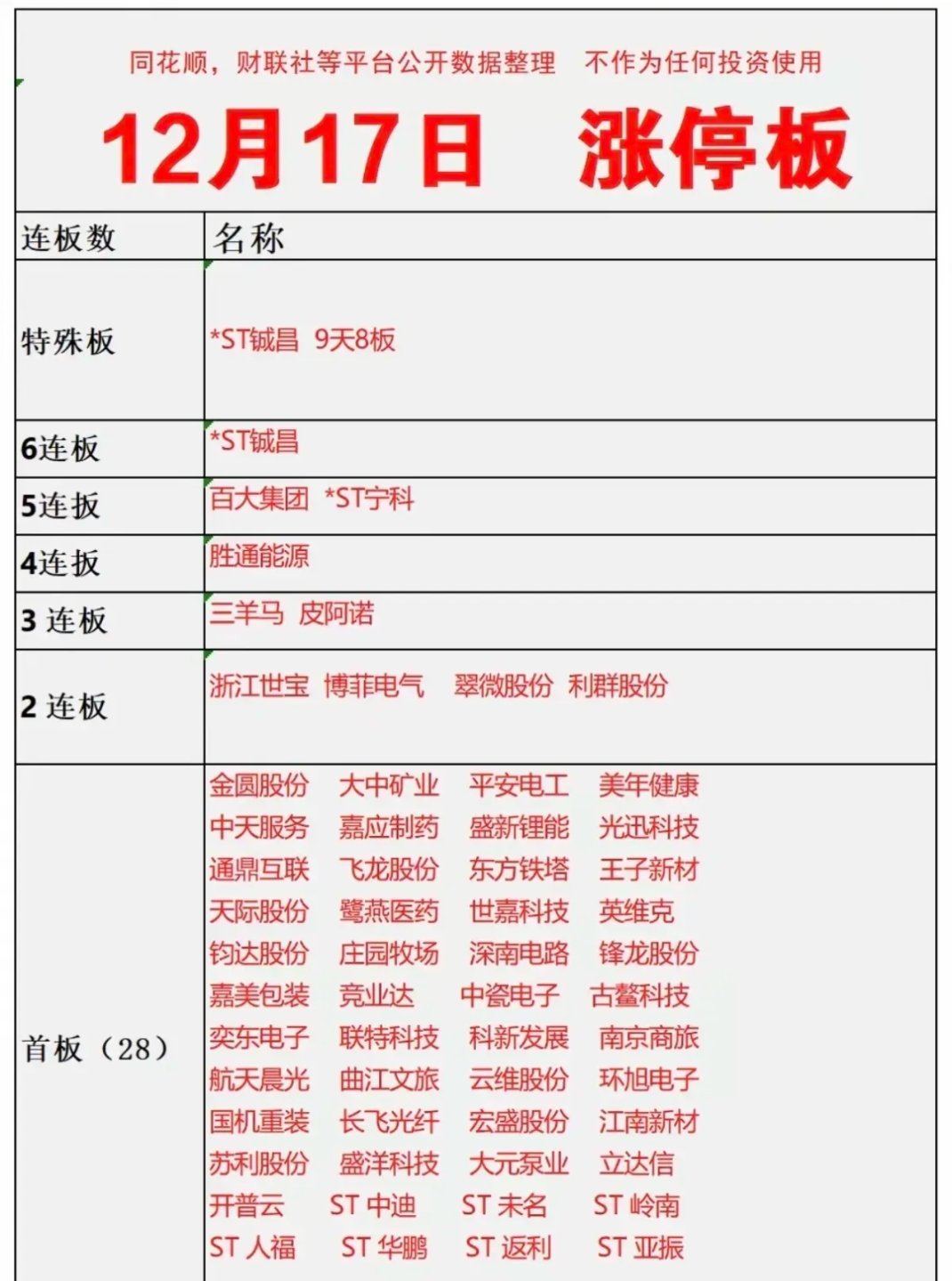 12月17日涨停板精简复盘- 连板梯队:*ST铖昌(6连板/9天8板)成绝对龙头,百大集团、*ST宁科5连板,胜通能源4连板,三羊马、皮阿诺3连板,2连板4只、首板28只。- 核心标的:*ST铖昌凭军工芯片+业绩扭亏领涨;百大集团、皮阿诺带动消费线;金圆股份、盛新锂能借锂价反弹掀资源股首板潮。- 市场特征:题材覆盖消费、汽车、通信、锂电等,板块联动活跃,短线炒作氛围浓。