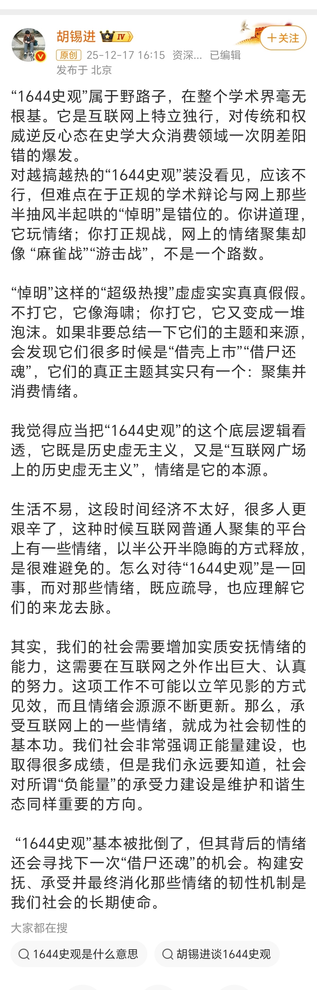 著名大V胡锡进:“1644史观”属于野路子,在整个学术界毫无根基。