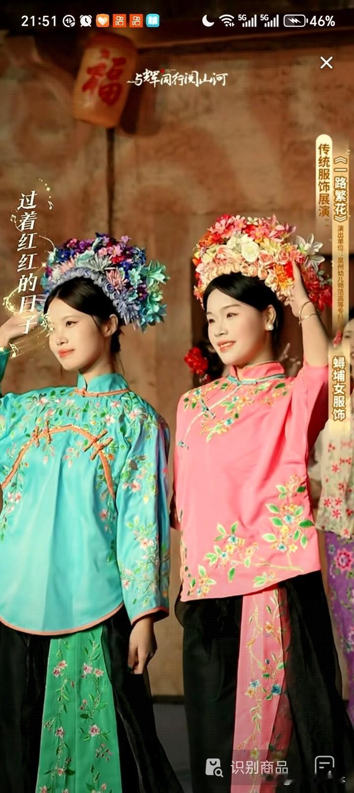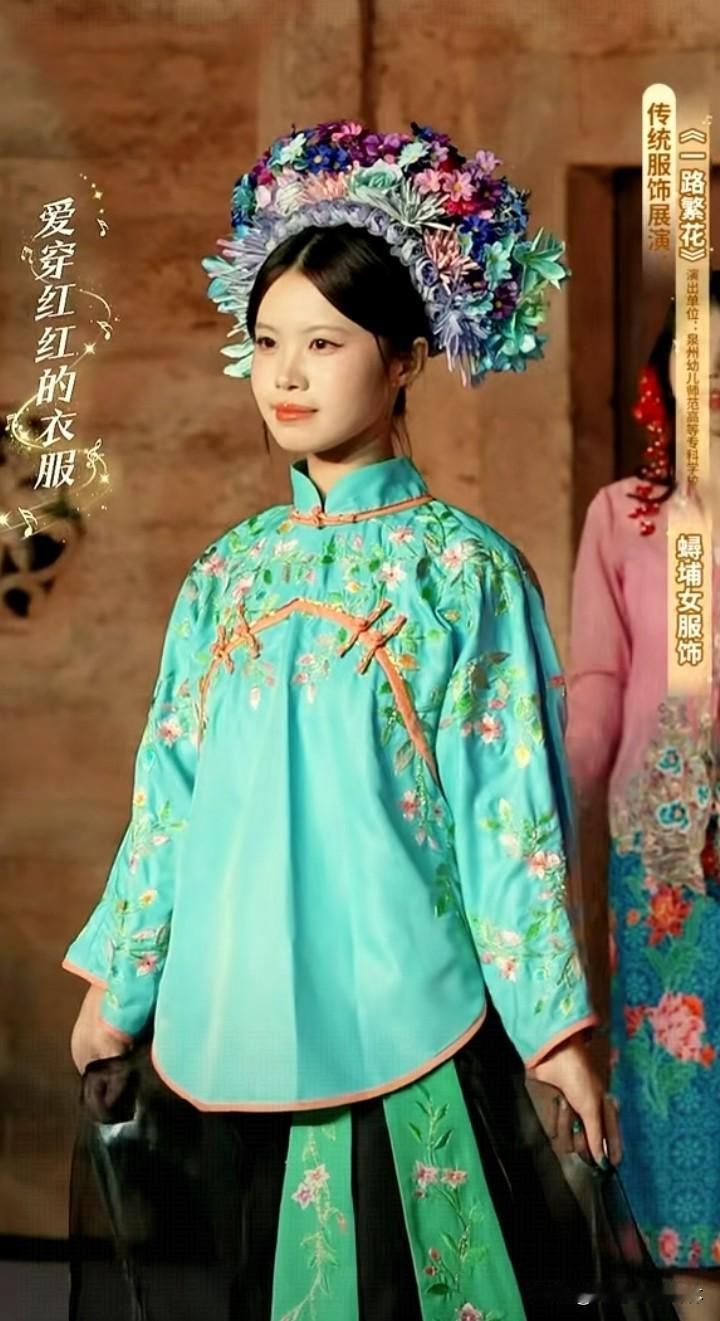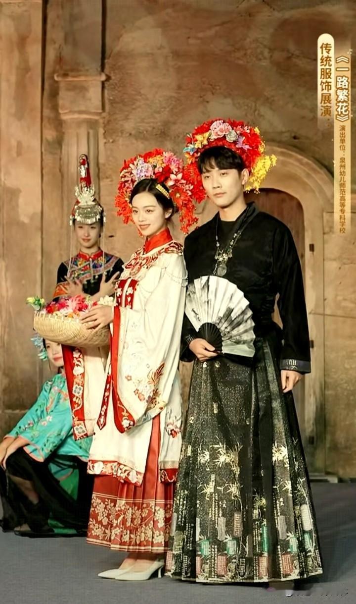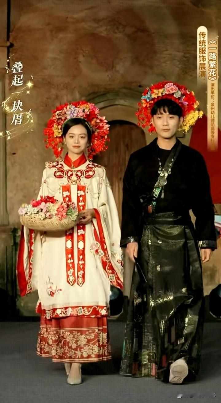 美翻了,福建泉州传统服饰展。 主播小贝手持一篮子花美艳明媚,鹏鹏戴簪花头饰手持扇子风流倜傥。 看了福建服饰走秀才知道服装的款式多,而且色彩以红、蓝、绿、黄等鲜艳色彩为主,即使是分体衣服,黑色的裤子也是搭配视觉冲击力很强的衣服,从服饰上能够感受到福建当地人奔放的性格特点。 观众的情绪也被精美的服饰点燃,起哄董宇辉也带簪花。董宇辉自嘲头太大,如果戴簪花就得像非洲雄狮。 曾经赵丽颖体验簪花带动簪花爆火,邓亚萍也体验簪花技艺并助力推广 ,今日一见福建泉州的美景风土人情精彩的节目,作为北方观众确实心动心驰神往。