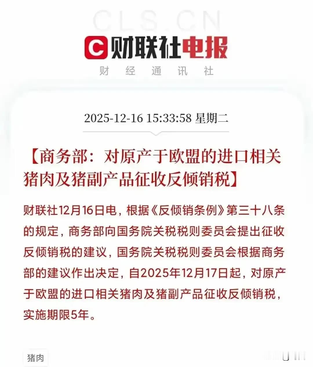 突发坏消息,市民担忧猪肉涨价,因我国对欧盟出口的猪肉征收最高20%反倾销税!事发12月17日,国家商务部表示,为了应对欧盟对我国新能源汽车加征收45%反倾销税,因为我国同步对欧盟国家征收猪肉反倾销税。 根据规定内容,该条款从12月17日立即生效,有效期为5年。其中,对西班牙出口猪肉征收约5%为最低,对荷兰征收约20%达到最高,对法国征收数税率为约10%居中。 不过有关人士认为,中国从欧盟进口的猪肉实际上只占消费总量的2%,比例很小,对于市场价格来说微不足道,不会引起猪肉大涨价。 商务部对欧盟出口中国猪肉征收反倾销税 欧盟出口中国的猪肉最高征收20%反倾销税
