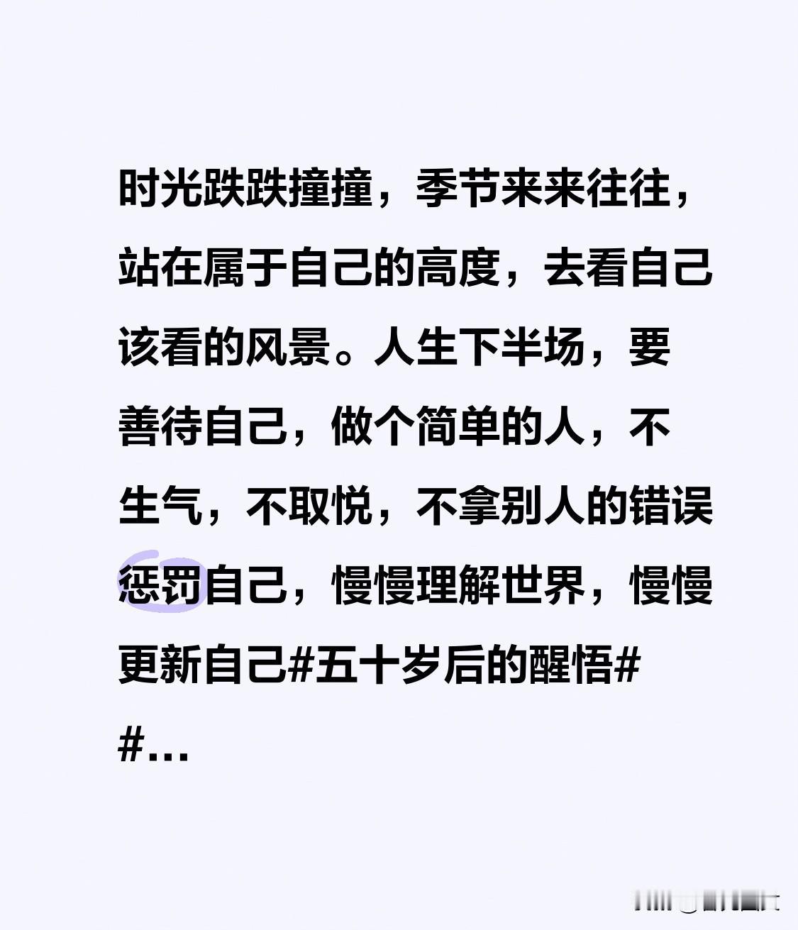 时光跌跌撞撞,季节来来往往,站在属于自己的高度,去看自己该看的风景。人生下半场,要善待自己,做个简单的人,不生气,不取悦,不拿别人的错误惩罚自己,慢慢理解世界,慢慢更新自己 五十岁后的醒悟 迈入中年的体悟 于风景中见自己