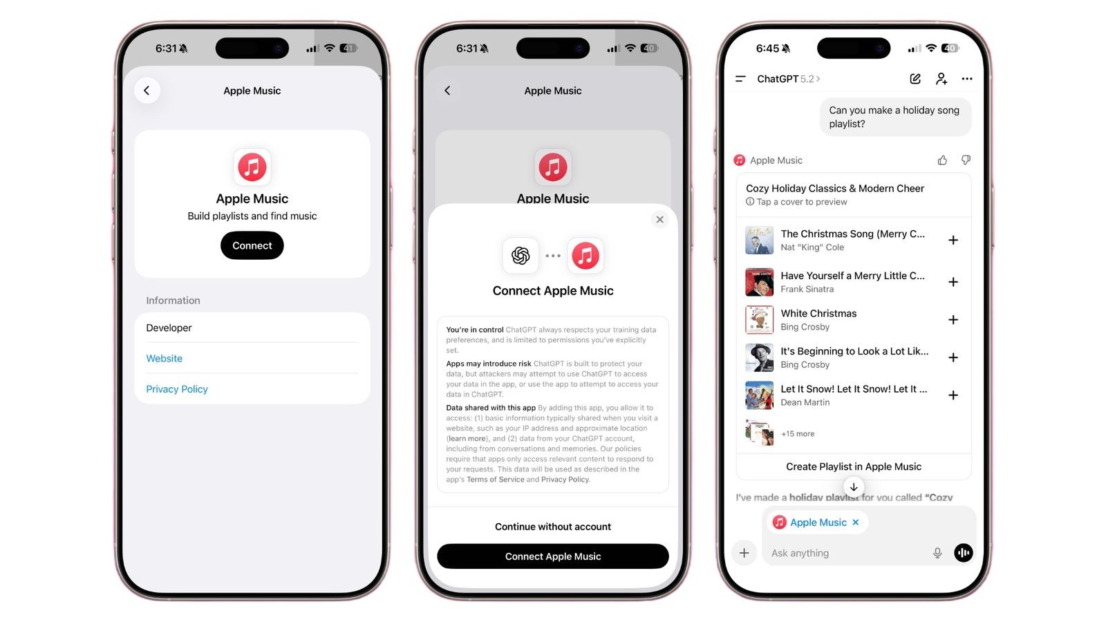 【ChatGPT 的 Apple Music 集成现已推出】ChatGPT 现已推出 Apple Music 集成,ChatGPT 可以根据你的 Apple Music 收听历史记录提供音乐推荐并创建播放列表。你可以通过 Mac 应用、网站或在 iOS 应用的“设置”部分将 Apple Music 添加至 ChatGPT。Apple Music 在“应用”选项下,连接 Apple Music 需要使用 Apple 帐户登录以进行授权。即使没有 Apple Music 订阅,用户也可以使用 ChatGPT 搜索 Apple Music 中的歌曲、歌手、专辑和播放列表。OpenAI 表示,所有用户都可以使用 ChatGPT 发现音乐、创建播放列表并收听试听片段。Apple Music 订阅用户可以使用 ChatGPT 将歌曲、专辑和播放列表添加至 Apple Music 资料库。将 Apple Music 添加至 ChatGPT 后,点击“+”按钮即可选择。ChatGPT 生成的播放列表和推荐可以直接在 Apple Music 中打开。ChatGPT 的 Apple Music 功能于昨日首次公布,但当时尚未正式推出。Apple Music 现可添加至 ChatGPT 中。