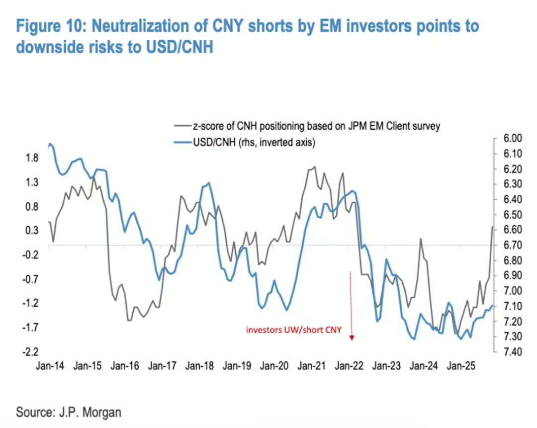 新兴市场投资者正在加速平仓过去几年积累的巨额人民币空头头寸,这种从看空向中性仓位的回归构成了汇率反弹的微观结构支撑。根据摩根大通的客户持仓Z-score指标,当前空头回补进程尚未结束,这一筹码结构的再平衡在历史经验上与人民币对美元的升值趋势高度正相关