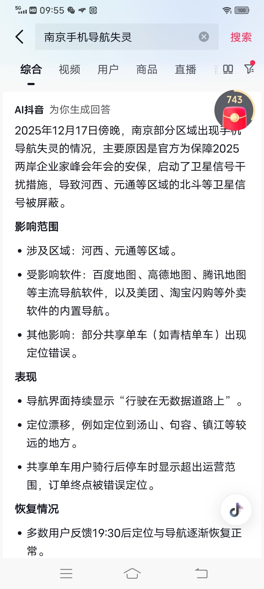 12月17日傍晚时分,南京部分地区突发手机导航失灵的情况。有网友在社交平台吐槽: “在新街口说我在栖霞,导地铁站说我要走三小时,还好凭记忆找到了”。 “晚上下班打卡的时候显示在新塘水库, 还是在水库边上”。 “我在新街口显示我在莫愁湖底下”。 也有网友表示:同事的几个苹果手机都失灵了,而自己的小米手机正常。 为什么会发生手机导航失灵的突发情况?ai给出的回答是南京正在举办“两岸企业家峰会年会”,所以把部分信号屏蔽了。 该说不说,南京当地人还好说,如果是去南京旅游的,遇到这种情况,那就真的是两眼一抹黑了!
