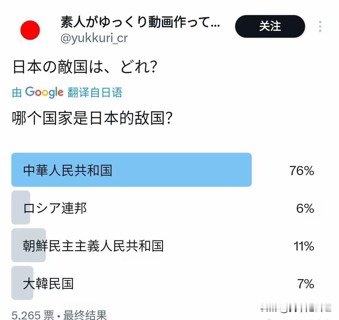 这份民调的数据低了,绝对不止76%。保守估计应该在90%以上。 网传的这份日本对别国民调显示,中国位列第一。虽说我觉得这个数据低了,但不妨碍其真实反映日本国民的对华态度。 记得前两天还刷到一个挺大的V也表达他的看法(忘了哪个人了),他说他不认同这个数据,意思是他觉得高的离谱了,不可能,日本绝对不可能这么看待中国。 不知道他是从哪里觉得不可能,还是说他有资金来源而说不可能。这都不好说!