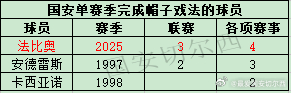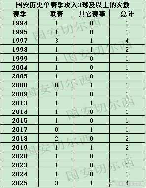 【赛季数据总结-帽子戏法(球员、球队篇)】 2025赛季球队在联赛共完成3次帽子戏法,各项赛事完成4次,单赛季联赛和各项赛事完成帽子戏法次数都追平1997赛季,并列历史最多。球队职业联赛历史上共完成22个帽子戏法(甲A时代有7个,中超联赛以来共有15个),各项赛事共完成29个。 本赛季球队在联赛完成的3个帽子戏法和各项赛事的4个帽子戏法都是法比奥完成的,法比奥单赛季联赛3次和各项赛事的4次帽子戏法,都超越1997赛季的安德雷斯(联赛2次,各项赛事3次),创历史新高。法比奥在国安以来在联赛共完成4次帽子戏法,以及各项赛事完成5次,也都超越了卡西亚诺(联赛3次,各项赛事4次),为历史最多。还是首位在主场完成大四喜的球员。同时法比奥连续完成五次帽子戏法也是历史的首次。 法比奥在足协杯决赛上演帽子戏法,这是球队历史首位在决赛中上演帽子戏法的球员。也是历史首位在单赛季联赛和足协杯都上演过帽子戏法的球员。还是首位在单赛季在主场、客场和中立场地都上演过帽子戏法的球员。(注:本数据统计的帽子戏法包括三球及三球以上)
