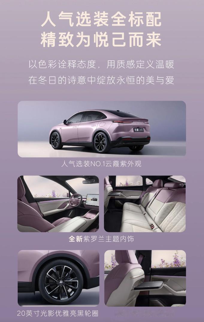 乐道L60紫罗兰限定版上市,限量666台,整车售价21.49万元,BaaS电池租用方案15.79万元,上市即交付,年内购车还能省一笔购置税,至高1.1万元。限量版比标准版贵了8000元,标配人气选装云霞紫外观、20英寸双色轮圈、后排右侧折叠桌板,丁香紫+柔白双拼高级皮革座椅,大理石纹装饰板,这也是乐道首次用错位双拼内饰,情绪价值这方面给到位了。【来自懂车帝车友圈】