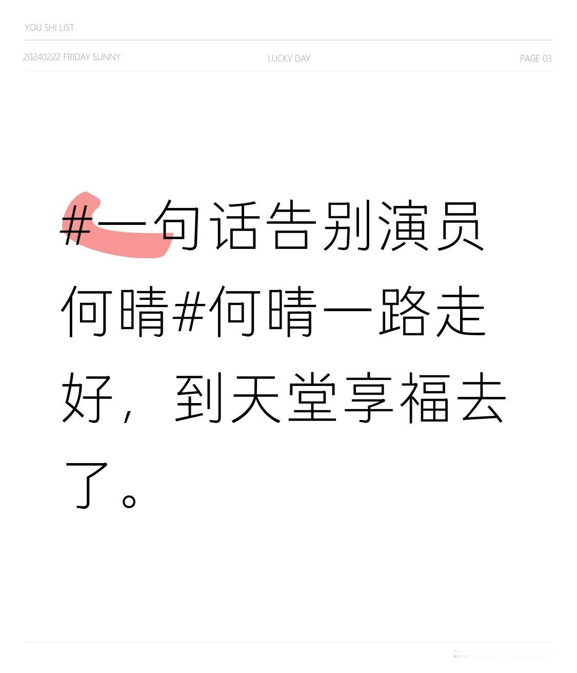 一句话告别演员何晴何晴一路走好,到天堂享福去了。