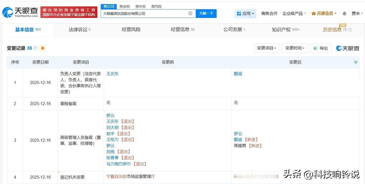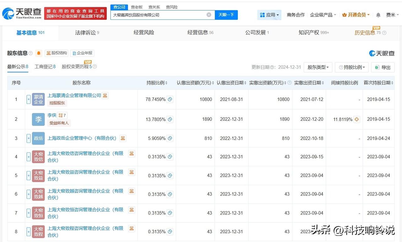 【创始人卸任大窑嘉宾饮品公司职务 创始人退出大窑嘉宾饮品公司 创始人接连退出大窑关联公司】 天眼查App显示,近日,大窑嘉宾饮品股份有限公司发生工商变更,大窑汽水创始人王庆东卸任该公司法定代表人、董事长,戴诚接任法定代表人并担任董事,同时,多位高管发生变更。 该公司成立于2019年4月,注册资本约1.4亿人民币,经营范围包括食品及生物工程的技术开发、技术咨询、技术服务等,由上海蒙清企业管理有限公司、李侠、上海政岳企业管理中心(有限合伙)等共同持股。此前,王庆东卸任大窑香港旗下天津卓信企业管理有限公司法定代表人、执行公司事务的董事、经理。 天眼查信息: