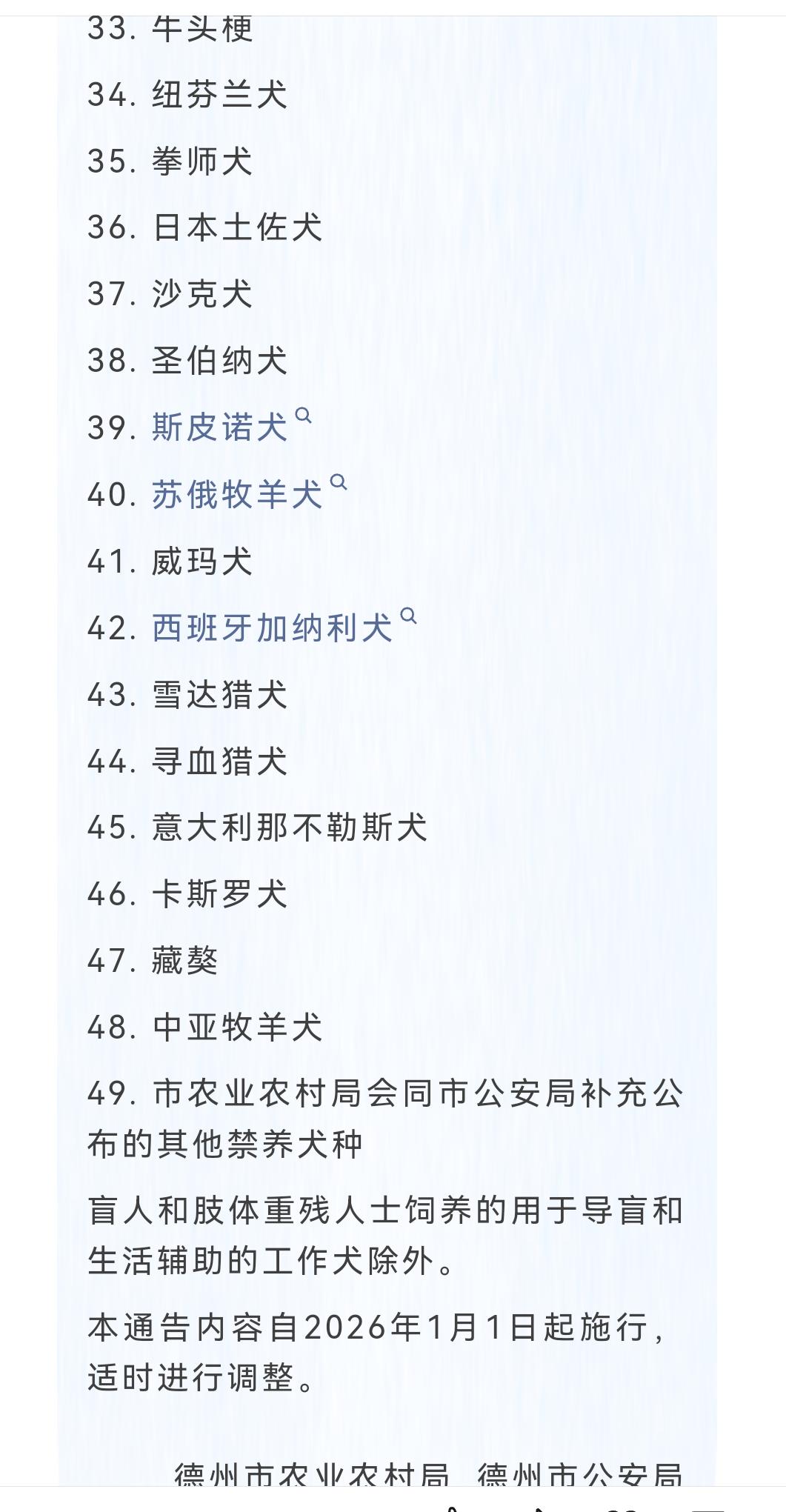 2025年12月15号,德州市农业农村局与德州市公安局联合发布禁养犬通告,通告内容于2026年1月1日起施行。 近些年,恶犬伤人事件屡禁不止,且愈演愈烈。各种大型犬、烈性犬横行居民区,严重威胁人民的生命安全。引发大量社会矛盾,危害社会稳定。养犬问题已经到了非解决不可的地步。 有了规定就要执行。为了大家的安全,希望养狗人自查自纠,希望居民积极举报,希望执法者主动出击。期待一个更美好的明天。