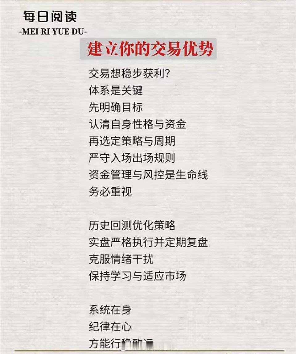 每日阅读:建立你的交易优势。交易想稳步获利?体系是关键。先明确目标,认清自身性格与资金,再选定策略与周期,严守入场出场规则,务必重视历史回测优化策略,克服情绪干扰。系统在身,纪律在心,方能行稳致远。