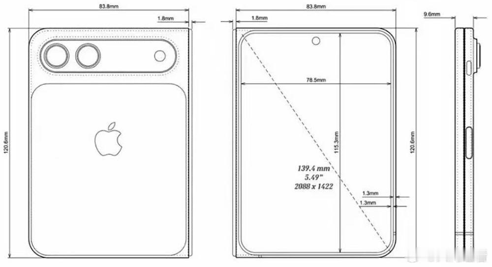 iPhoneFold渲染图再曝【苹果折叠屏手机尺寸信息曝光】○ 折叠态- 高 120.6mm,宽 83.8mm- 厚度 9.6mm(不含摄像头凸起)- 外屏为 5.49 英寸,分辨率 2088×1422○ 展开态- 尺寸为 167.6 × 120.6mm- 厚度 4.8mm(不含摄像头凸起)- 内屏为 7.76 英寸,分辨率 2713×1920Apple折叠屏手机我的观点不设限