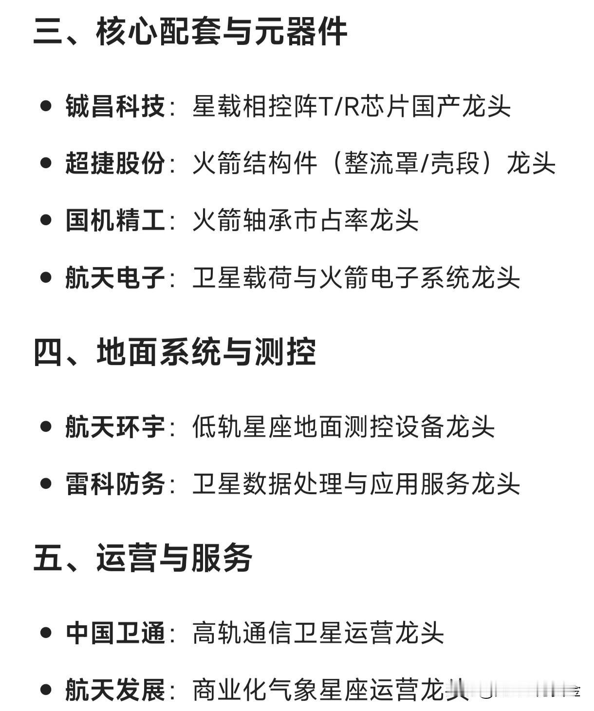 商业航天概念龙头企业汇总 一、卫星制造 中国卫星:国家队卫星制造龙头 上海沪工:商业卫星批量化生产龙头 二、火箭发射与动力 蓝箭航天:可回收液氧甲烷火箭龙头 天兵科技:大运力液体火箭组网龙头 星河动力:民营高频发射与快速响应龙头 航天动力:商业火箭发动机部件龙头 三、核心配套与元器件 铖昌科技:星载相控阵T/R芯片国产龙头 超捷股份:火箭结构件(整流罩/壳段)龙头 国机精工:火箭轴承市占率龙头 航天电子:卫星载荷与火箭电子系统龙头 四、地面系统与测控 航天环宇:低轨星座地面测控设备龙头 雷科防务:卫星数据处理与应用服务龙头 五、运营与服务 中国卫通:高轨通信卫星运营龙头 航天发展:商业化气象星座运营龙头