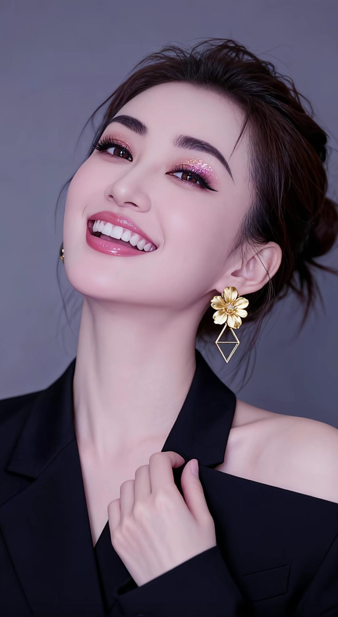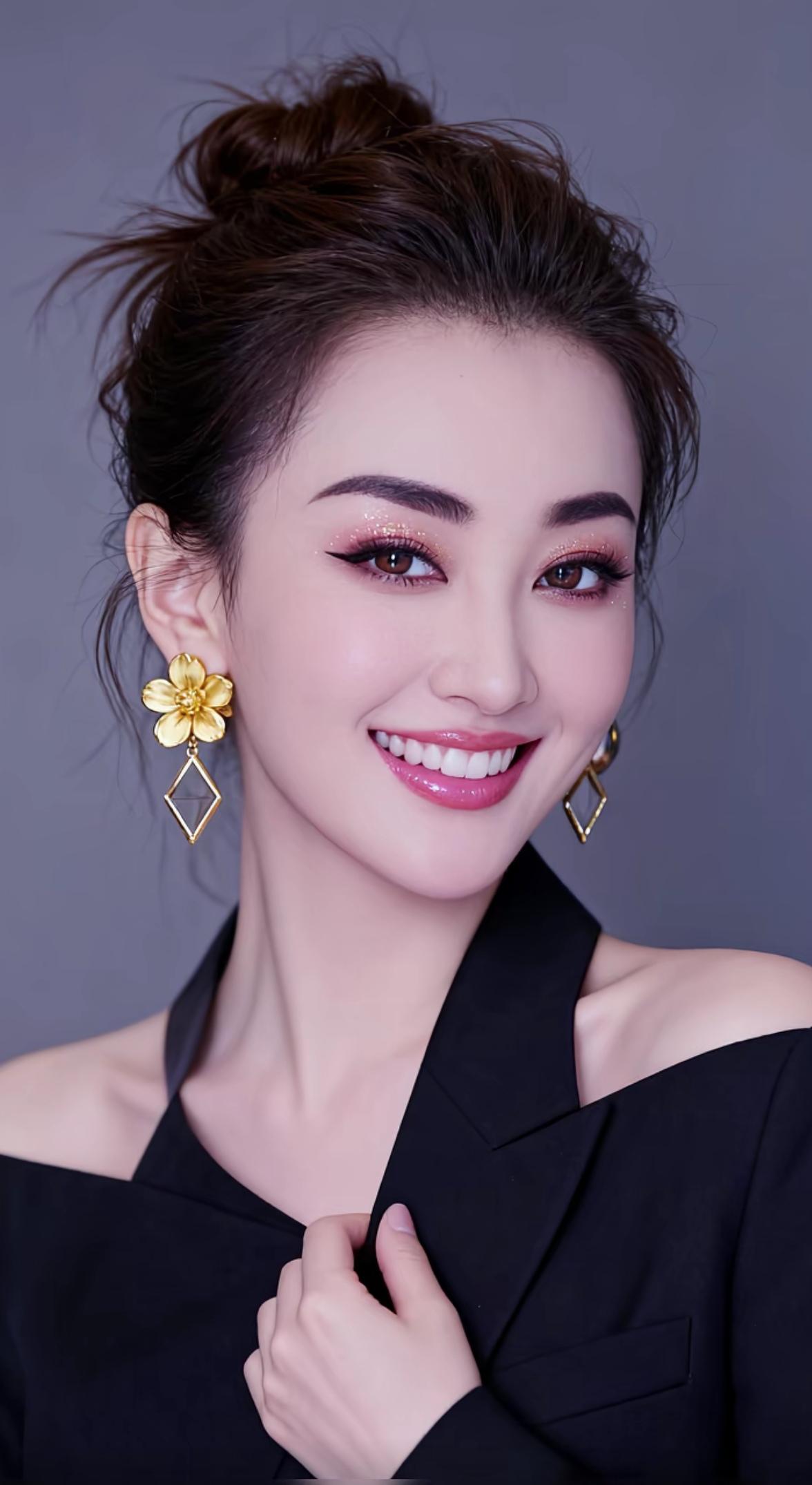 优雅黑西装,闪耀金耳环,甜美笑容,时尚与优雅的完美结合!🌟✨