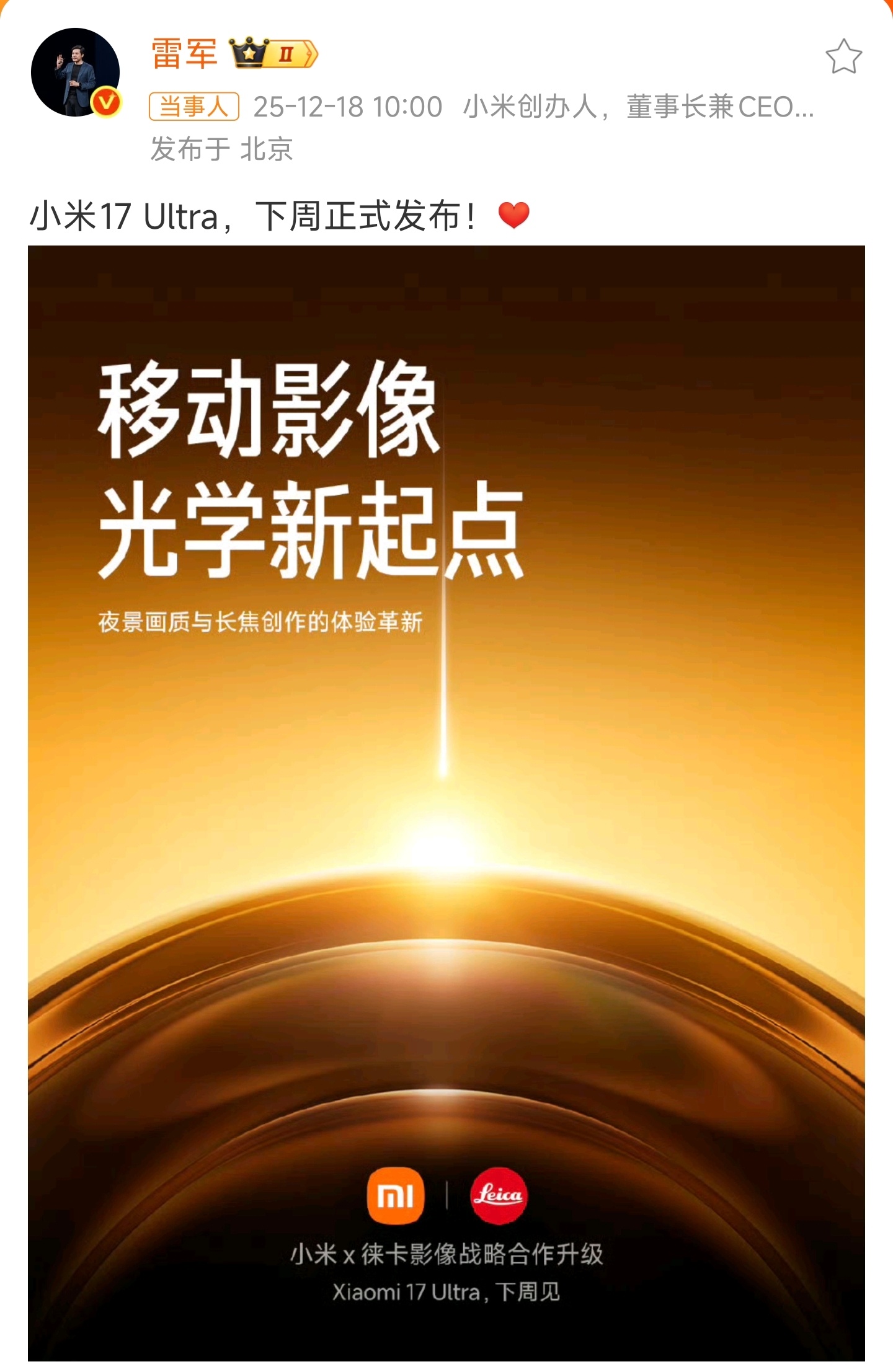 小米17Ultra下周发布这次保密工作做得真好我同事说没有王腾连外观长啥样都不知道了……这锅背的新机来了
