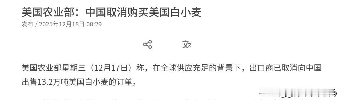 事情严重了!中国取消美国的订单!12月18日,根据外媒报道,中美关系刚趋于稳定之后,美国又在台湾问题上做文章了。外媒称,美国将启动逾111亿美元对台军售案。这一军售案销售的军品包括M109A7自走炮、海马士远程精准打击系统续购、拖式导弹续购、反装甲型无人机导弹系统、海军标枪反甲导弹续购、鱼叉导弹等等。 评几句 美国此次逾111亿美元的对台军售案,不仅金额巨大,更重要的是其政治信号极其危险。这相当于在中美关系刚刚企稳的关键节点上,美国再次在台湾问题上"踩红线"。中国取消13.2万吨美国小麦订单绝非偶然,这是向美方发出的明确信号:经贸合作必须建立在政治互信基础上,美国不能一边损害中国核心利益,一边还指望从中国市场上获利。 从战略层面看,美国此举暴露出其对华政策的严重矛盾。一方面寻求与中国稳定关系,另一方面又在台湾问题上不断挑衅,这种"两面下注"的做法极不负责任。中国的反制手段远不止取消农产品订单这么简单,稀土管制、军演威慑等选项都在工具箱内。美国必须认识到,台湾问题是中国的核心利益,在这个问题上,中国没有任何妥协空间。 这次事件再次证明,经贸关系已经成为中美战略博弈的重要筹码。美国农业部的数据透露出一个微妙信息:中国采购商是在"一年多来首次采购美国小麦"后突然取消订单,这种时机选择绝非巧合。它表明中国正在将经济手段与政治立场更加紧密地结合,用市场力量来维护国家利益。如果美国继续在台湾问题上玩火,等待它的可能是更大规模的经贸反制。