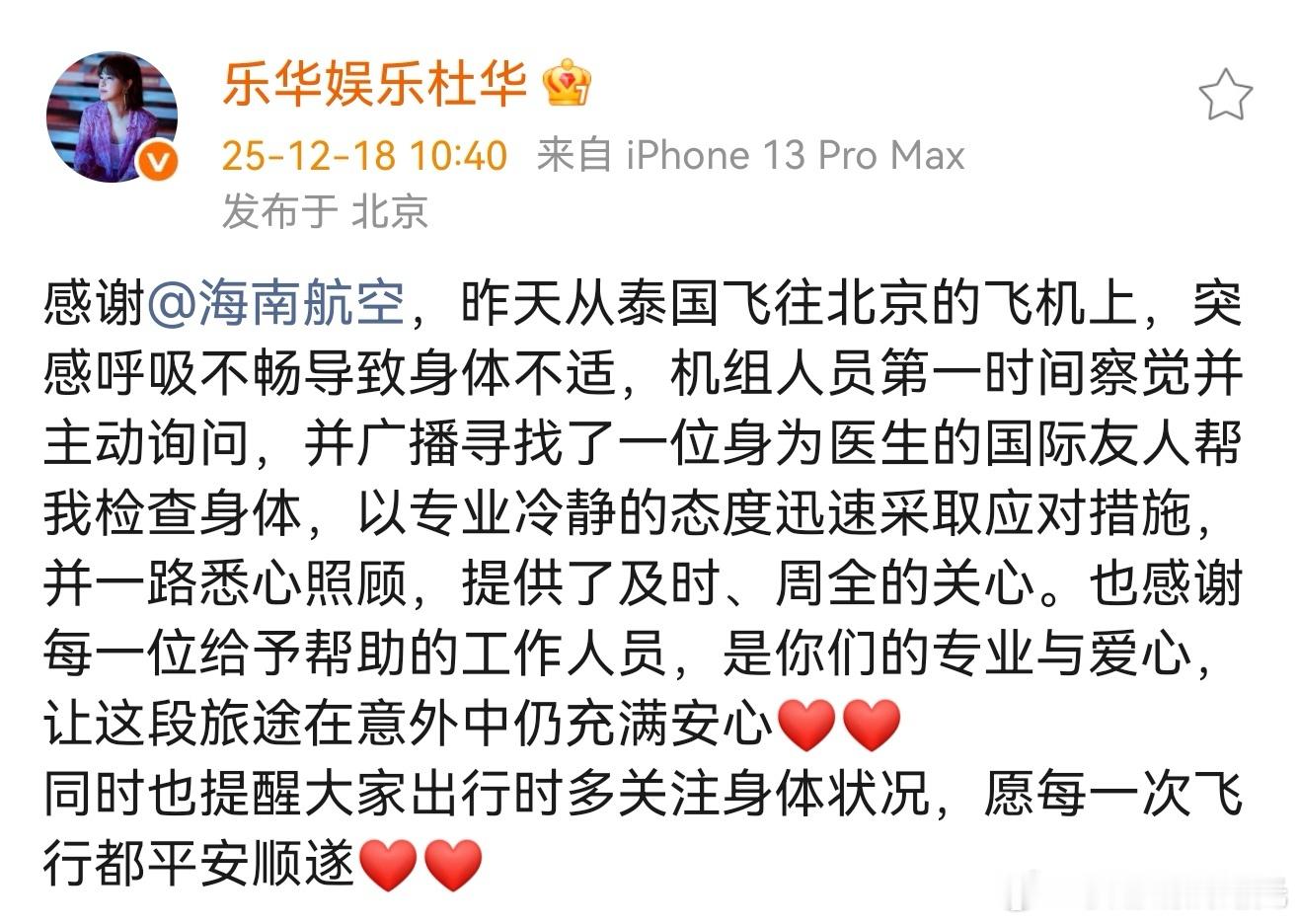 杜华感谢海南航空杜华发博感谢海南航空 杜华说昨晚从泰国飞北京,突然感觉身体不适,机组人员第一时间察觉并主动询问,并广播寻找了一位身为医生的国际友人帮我检查身体,以专业冷静的态度迅速采取应对措施,并一路悉心照顾,提供了及时、周全的关心。于是,杜华特地发博感谢海南航空。