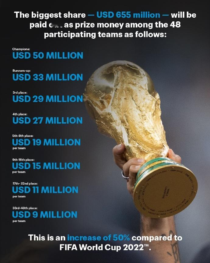 2026世界杯冠军奖金5000万美元 国际足联日前宣布,参加2026年美加墨世界杯的48支球队将获得总计7.27亿美元的奖金和补贴,其中冠军将获得5000万美元奖金。根据分配方案,6.55亿美元将被用于发放奖金,其中冠军将获得5000万美元,亚军将获得3300万美元,季军将获得2900万美元,即便是最后一名也可以获得900万美元。此外每支参赛球队还将获得150万美元的“备战费用补贴”。这意味着,只要打入世界杯决赛圈,每支球队至少可以获得1050万美元。