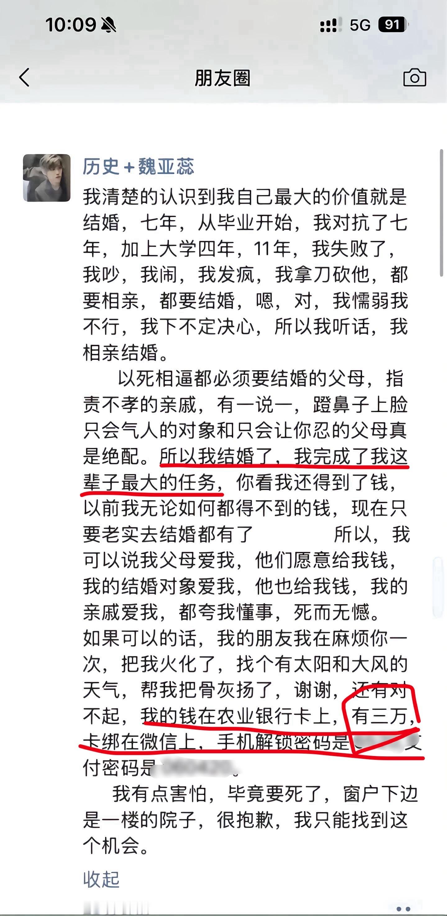 28岁,重点高中在编教师,笔试面试双第一的优秀履历——魏亚蕊本应拥有星光璀璨的人生,却在婚礼当天以穿日常衣裤、反锁房门、纵身跃下7楼的方式,给世界留下最决绝的告别。这是原生家庭用11年催婚、经济控制、道德绑架酿造的谋杀,是“重男轻女”观念下,一个女性个体价值被彻底碾碎的血淋淋现实。——原生家庭对她的剥削,是赤裸裸的交易。从17岁起就被催婚,大学四年到毕业七年,抗争十年有余却始终逃不过父母的掌控——工资卡被扣押,每月仅给500元生活费,27万彩礼被直接截留作为弟弟的结婚准备金,她的婚姻从头到尾就是一场为弟弟“铺路”的买卖。当魏亚蕊婚前发布取消婚礼的通知时,父母的第一反应不是询问女儿的苦衷,而是担心退还彩礼损失利益,硬是逼着她走上这条绝路。这种把女儿当“附属品”“提款机”的家庭,哪里有半分亲情可言?——更恶毒的是原生家庭施加的精神绞杀。用“不孝”的帽子堵死她的辩解,用“以死相逼”瓦解她的抵抗,用亲戚轮番说教的舆论压力让她孤立无援。在这个家庭里,她的个人意愿一文不值,她的职业理想、情感需求、心理状态全被无视。朋友圈留下“我有点害怕”的遗言,在办公室暗示过不愿结婚,筹备婚礼时状态差到肉眼可见,这些求救信号在家人眼里,全是“不懂事”的矫情。他们一边榨取她的经济价值,一边摧毁她的精神世界,直到把她逼进“要么结婚,要么毁灭”的死胡同。最讽刺的是,在她死后,父母的第一反应不是悲痛,而是推诿责任——声称“已经嫁出去了”,把遗体归属权甩给婆家,全然不顾女儿生前连后事都不愿托付给他们,只求好友将骨灰扬了,不愿再与这个家有任何牵连。——从活着时被当作“摇钱树”,到死后被视为“麻烦包袱”。这个原生家庭从未把她当成一个独立的人,只把她当作可利用、可丢弃的工具。杀死她的是家庭无休止的压榨和裹挟~坠楼女教师有已婚哥哥和未婚弟弟 妇联回应28岁女教师结婚当天坠亡女教师新婚坠亡一楼业主要求赔偿