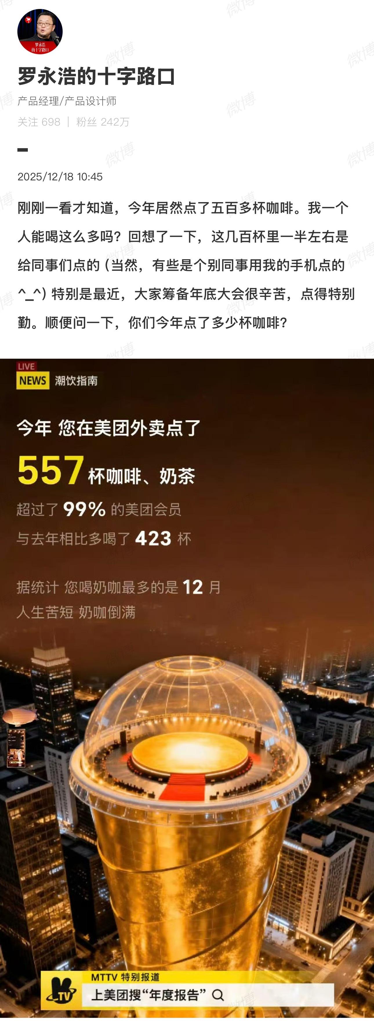 罗永浩一整年点了557杯咖啡奶茶罗永浩发博晒为了筹备年底的科技大会今年喝了557杯咖啡。不知不觉现在喝咖啡身体依赖已经远远大于精神依赖了,我去美团搜了年度报告,看见这个咖啡数据也是非常惊人!!!我猜大家都一样吧2025美团会员年度报告
