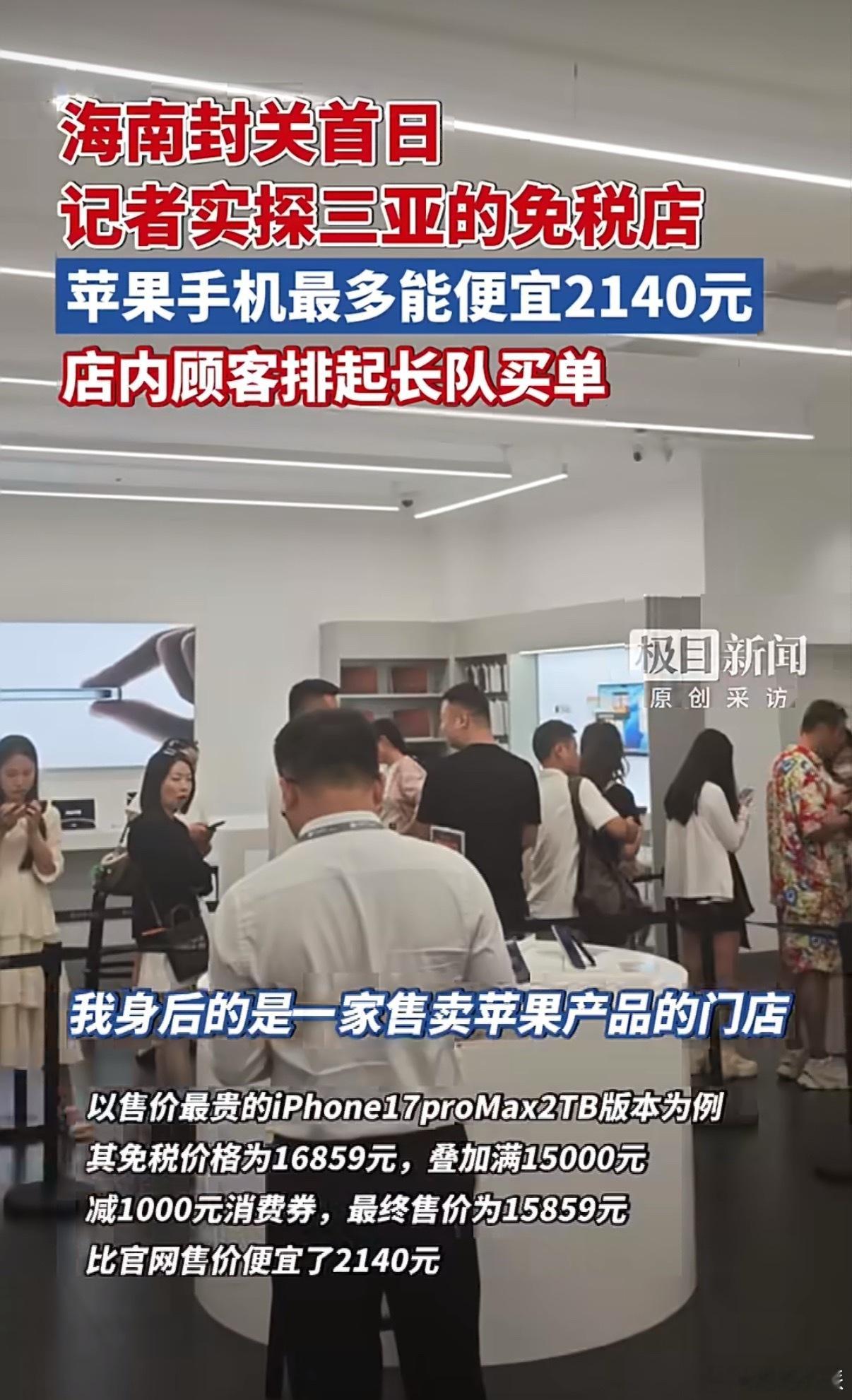 海南封关首日iPhone最高可减2140元那感情省下来的2000块钱就是我们去海南的机票不过也有好处,如果你本来就想去海南玩,又恰巧想买iPhone17,确实是可以省一笔钱