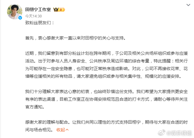 田栩宁公司不再接收应援相关物品田栩宁工作室发文提醒粉丝,关于跨年期间应援活动,出于安全考量,公司将不再接收花束、花墙等应援相关的所有物品,目前工作室正在协调安排规范且合适的打卡方式,希望大家以理性的方式支持田栩宁。2025娱乐年终盘点非正式跨年派对