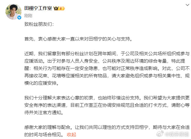 田栩宁期待在合适的时间与场合相见 田栩宁工作室回应跨年应援:“目前工作室正在协调安排规范且合适的打卡方式,请耐心等待并关注官方通知。”让我们共同以理性的方式支持田栩宁,期待与大家在合适的时间与场合相见。
