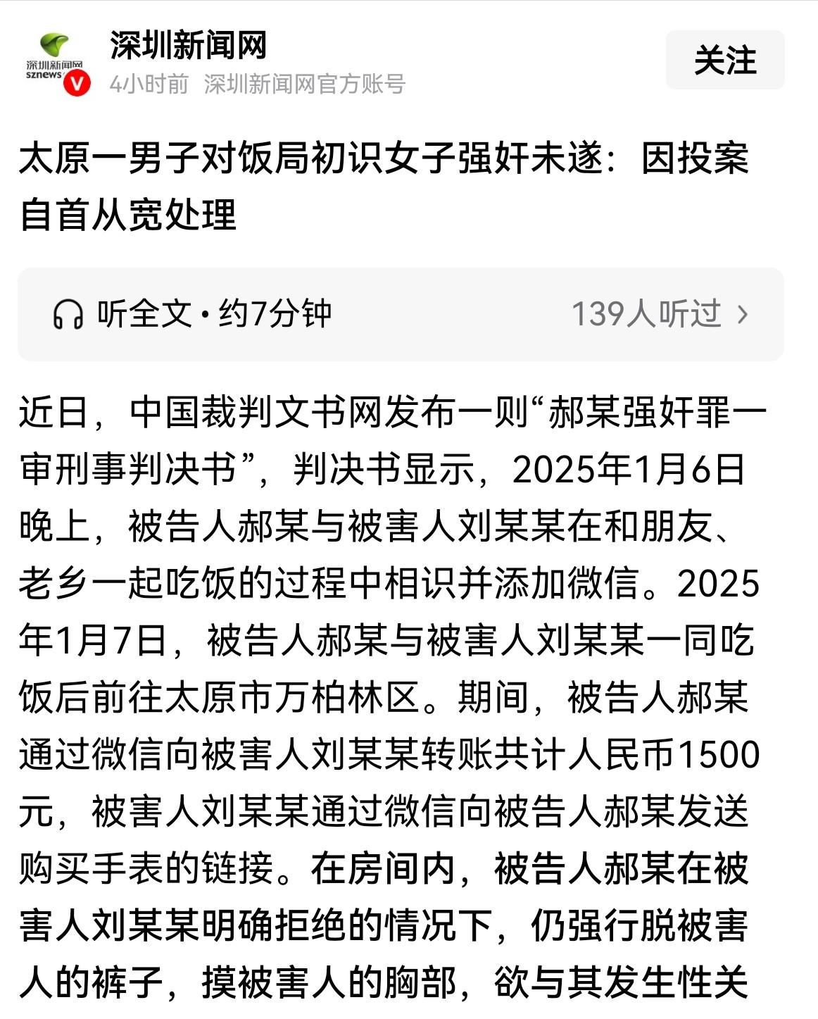 [微风]12月17日发布,山西太原,男子在朋友饭局上认识了一女子,两人相聊甚欢,加了好友。次日男子带女子出去吃饭,给女子转了1500元,女子给男子发了买表的链接,随后两人一起去了酒店,男子想跟女子发生亲密关系,女子明确拒绝,并反抗,男子才未得逞。事后女子报警,男子因此获刑,结果让人意想不到。 (信源:深圳新闻网——太原一男子对饭局初识女子强奸未遂:因投案自首从宽处理) 32岁的郝某在太原做建材生意,那天跟着朋友去饭局应酬,一眼就看中了邻桌的刘某。刘某性格开朗,聊起天来风趣幽默,郝某借着酒劲加了她的微信,临走前还约好第二天一起吃饭。 第二天中午,郝某特意选了家高档日料店。席间两人相谈甚欢,刘某提到最近看上一款手表,发了链接给郝某“参考”。 郝某觉得表现的机会来了,当场转了1500元过去,说“先拿去吃点好的”。刘某没多想,收下钱后回请郝某喝了杯咖啡。 下午3点多,刘某说还有朋友在附近办事,约好过来汇合。郝某提议“找个地方等”,顺势把刘某带进了附近的快捷酒店,开了间钟点房。 进房后没十分钟,郝某就借着酒劲向刘某提出发生亲密关系,没想到被当场拒绝。 “都跟我来酒店了,还装什么?”郝某觉得丢了面子,加上之前转了钱,更觉得“理所当然”。 他不顾刘某的反抗,伸手去扯她的衣服。刘某拼命挣扎,大喊“救命”,还咬了郝某的胳膊一口。郝某被突如其来的反抗吓住,一时没敢再动。 刘某趁机抓起包跑出酒店,惊魂未定地打了报警电话。郝某起初还满不在乎,觉得“就是情侣间的小摩擦”,直到警察找上门,他才慌了神:“我转了钱,她也跟我进酒店了,怎么就是强奸?” 性同意是明确且自愿的,没有默认选项。很多男人误以为,女人收了礼物、跟自己去酒店,就是“同意发生关系”,这是完全错误的。 我国法律明确规定,只有对方明确、自愿表示同意,才能发生亲密关系,任何形式的强迫都可能构成强奸。 案件审理时,郝某的律师辩解说,1500元是“交往花费”,去酒店是“临时休息”,郝某只是“一时冲动”,算不上犯罪。但法院调取的证据,直接推翻了这些说法。 酒店监控显示,刘某进房后一直站在门口玩手机,多次看时间,明显是在等人;刘某的微信记录里,她进酒店后就给朋友发消息“快来,这人有点不对劲”;郝某的供述也承认,刘某明确说过“不行”,但他觉得“女人说不要就是要”,才强行动手。 更关键的是,刘某的反抗痕迹很明显——胳膊上有淤青,郝某的胳膊上有咬痕,这些都能证明她不是“半推半就”,而是真的在激烈反抗。 法院最终认定,郝某违背妇女意志,强行与刘某发生性关系,因意志以外的原因未得逞,构成强奸罪(未遂)。 可能有人会问:未遂也要坐牢?答案是肯定的。根据我国刑法,强奸罪未遂同样构成犯罪,只是量刑会比既遂轻。 法官在判决时说:“正是因为很多人觉得‘没成事儿就不算犯罪’,才会有这么多强迫行为发生。必须让大家知道,法律的底线不能碰。” 这起案件里,还有个细节值得深思。郝某转的1500元,刘某并没有主动索要,是郝某自己“为了表现”转的。 很多男人会陷入一个误区:我为你花钱了,你就该“回报”我。这种把感情和身体当成交易的想法,本身就是对女性的不尊重,更是法律所不允许的。 这起案件该给所有男人敲警钟:收礼物≠同意,去酒店≠同意,甚至之前有过亲密关系,也不代表这次就同意。性同意从来不是“猜”出来的,而是“问”出来的。 尊重女性的意愿,不仅是道德要求,更是法律红线。你觉得郝某冤吗?评论区聊聊你的看法,也把这个教训转给身边的朋友。