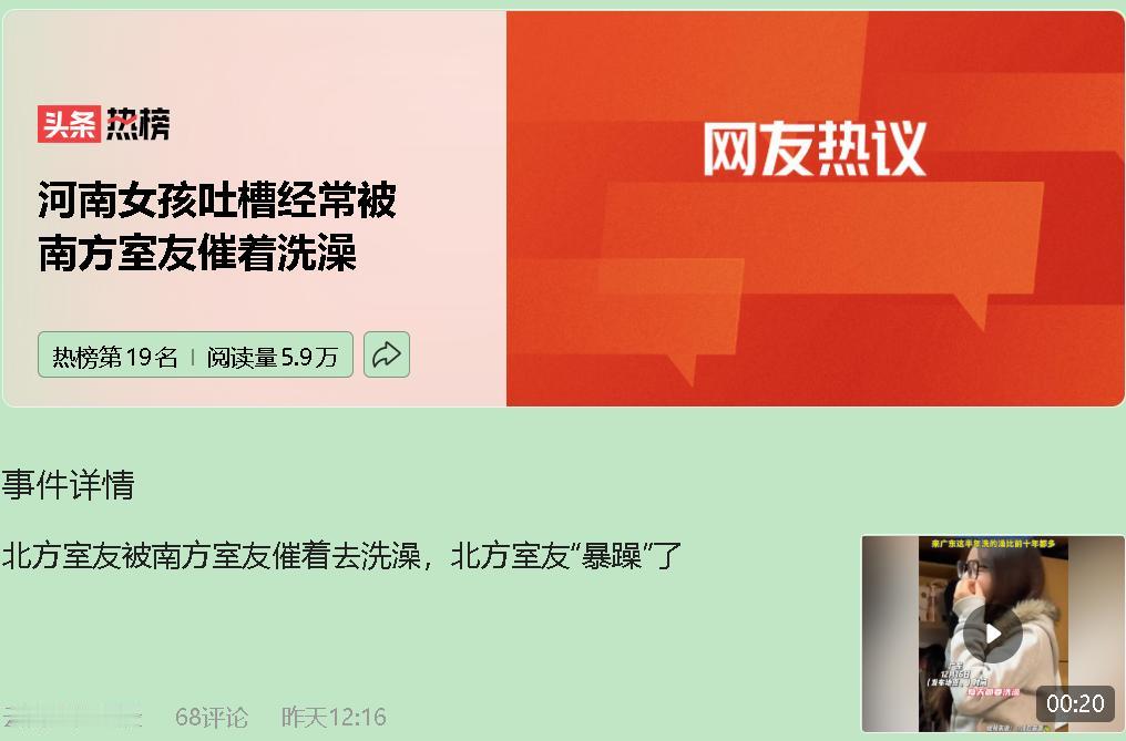 河南妹子一句吐槽,直接把南北洗澡大战送上了热搜!你以为这只是爱不爱干净?别傻了,这是两套被老天爷“调教”出来的生存法则在硬碰硬。 实话实说,我挺那北方姑娘。天天催人洗澡,真没必要。南方室友觉得“一天不洗浑身难受”,北方姑娘觉得“我又没脏,干嘛天天搓”?两边都没错,错的是非要把自己的习惯当成全世界的标准。 南方那种闷热,待过的人都懂。不冲个凉,身上就跟糊了层膜似的,睡觉都憋屈。所以他们把洗澡叫“冲凉”,图的是清爽。但北方呢?干燥得冒烟,皮肤自己那点油就是救命保湿霜。天天热水猛搓,真能给你干出皮屑来,痒得钻心。人家“攒几天搓个大的”,才是对自己皮肤负责。 说白了,都是老天爷逼出来的智慧。但一到集体生活里,味道就变了。“我天天洗”成了文明,“你几天一搓”就成了邋遢。这哪是讲卫生?这是用你的生活习惯霸凌别人。 真正的文明,不是让全世界按你的方式活。广东的回南天,北方同学加洗两次没毛病;北方的寒冬,南方朋友学着给皮肤“放个假”也是智慧。比立规矩更重要的,是好奇:“你们搓澡真能搓出泥丸子?”“哎,你们天天洗不怕皮肤干啊?” 世界那么大,活法那么多。离家上学、工作,遇见的不同远比想象的多。你可以守住自己的习惯,但也得学会看看外面的天气。适应不是认输,是成长。下次想催别人前,先想想:这条规矩,是不是也只适合从前的自己? 说到底,哪有绝对的对错。多一点“你这挺有意思”,少一点“你得跟我一样”,很多矛盾自己就化了。