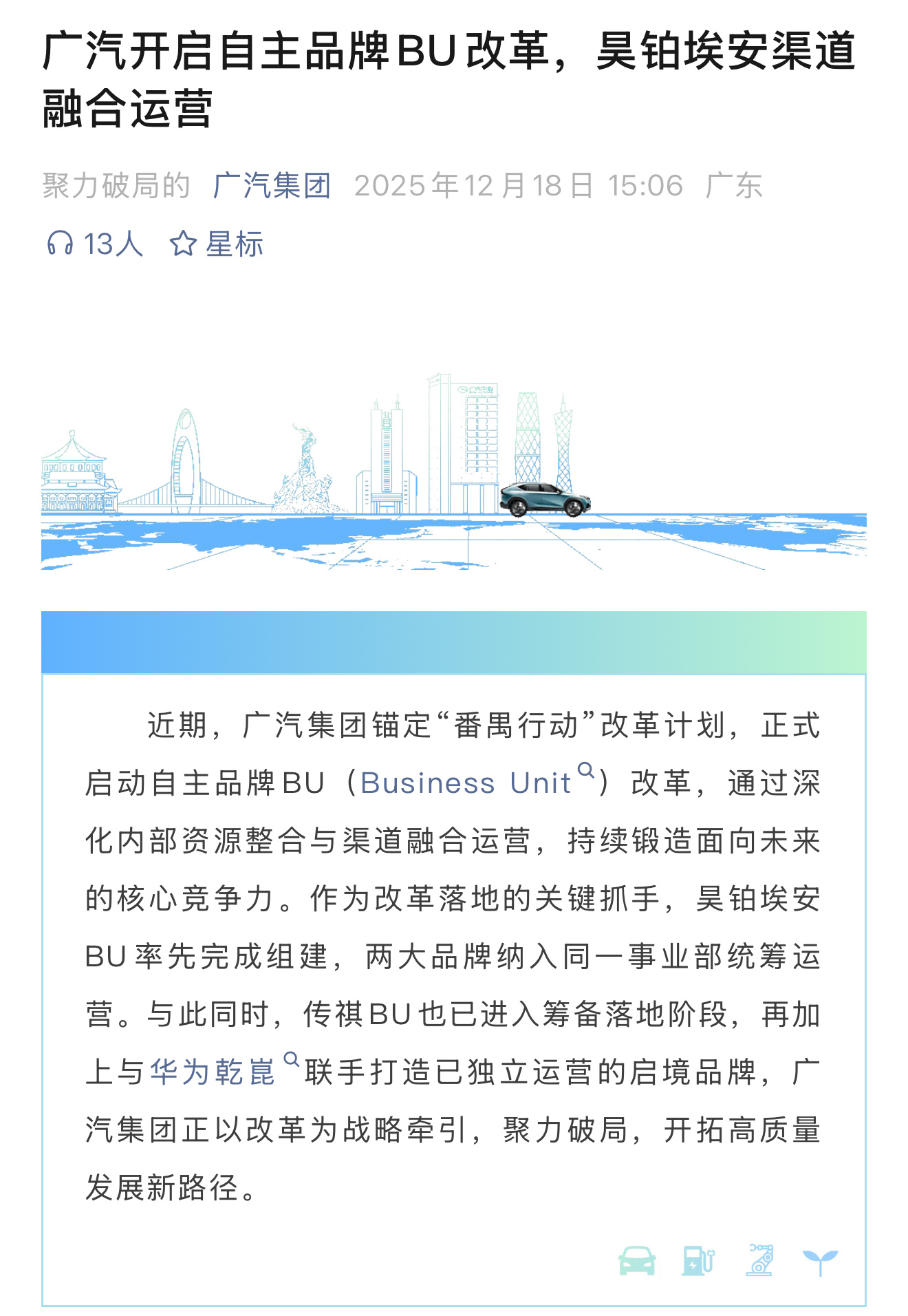 广汽自主品牌大改革!昊铂埃安“合体”运营面对车市激烈竞争,广汽集团最近有大动作——正式启动自主品牌BU改革,打头阵的就是昊铂与埃安。即日起,这两个品牌被划入同一事业部,开始融合运营。接下来,传祺BU也将跟进,加上与华为合作的启境品牌,广汽正通过一系列重组,聚力破局。合并的原因很简单:1+1>2。合并后,资源更集中、反应更快,昊铂专注高端“精英座驾”,埃安继续深耕“国民好车”,双线发力,提升整体竞争力。合并对昊铂车主影响很大:服务网点将从约200家大幅增至超1000家,覆盖更广,服务更便利。埃安用户:未来在同一店内,也能看到、体验到昊铂车型,满足消费升级需求。渠道融合分两步走:2026年1月底前,首批双品牌融合门店上线,覆盖超30城。2026年3月底前,完成全面融合,网点超1000家,实现全国四线以上城市全覆盖。广汽这次改革,你看好吗?广汽集团昊铂埃安BU完成组建