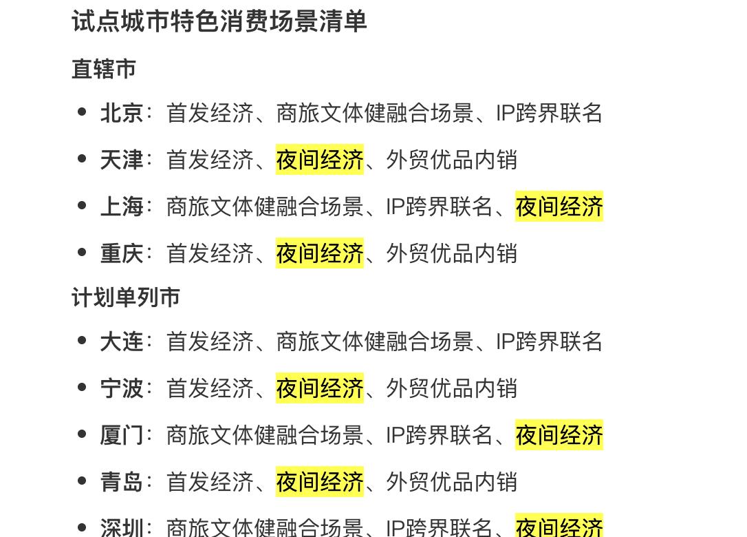 查看了消费新业态新模式试点城市的特色消费场景清单,总结起来一句话,喜欢大排档撸串、洗脚的兄弟们有福了。 试点城市特色消费场景最多的就是夜间经济,这说明夜生活要丰富起来了。 咱就是说,这个夜间经济到底指的啥,能明确一下吗?夜间刷卡消费399、699、899的,是不是不用提心吊胆了?