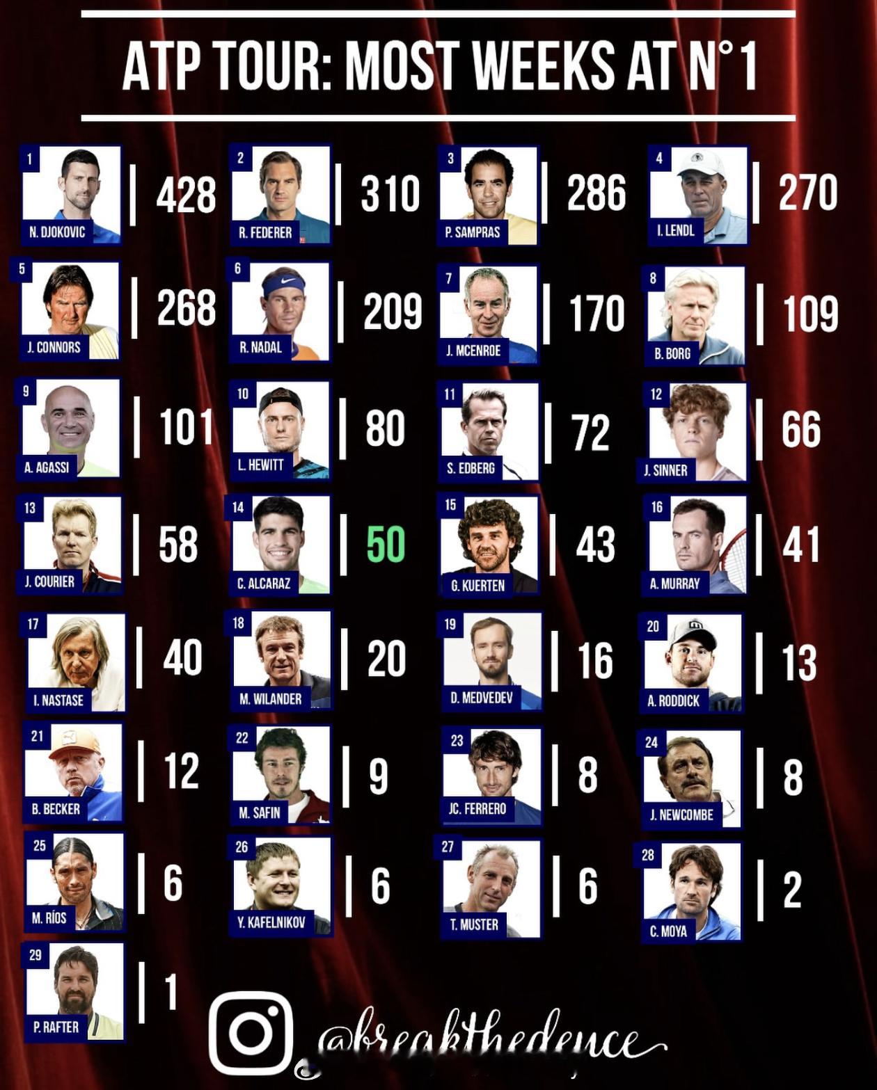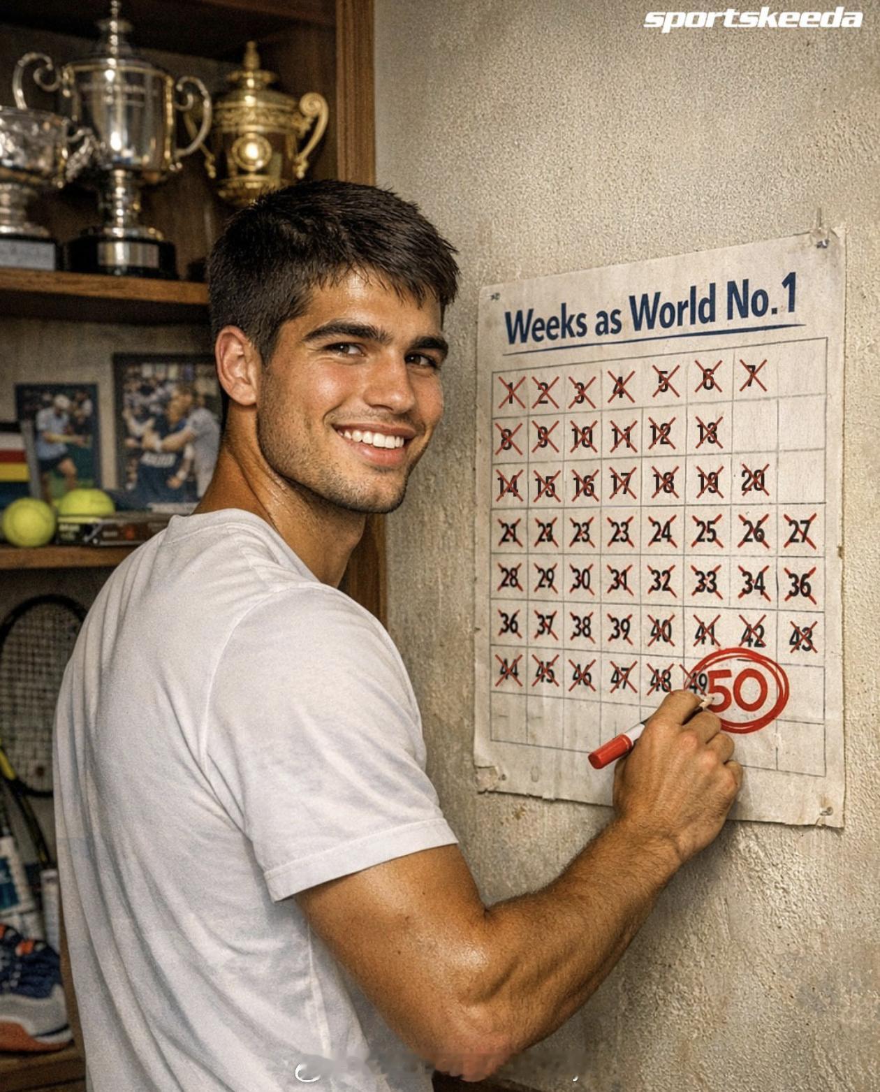 阿尔卡拉斯世界第一周数达50周🎾年仅22岁的卡洛斯·阿尔卡拉斯,本周在ATP排名中已累计位居世界第一达50周!更令人惊叹的是,他达成这一里程碑的年龄,比费德勒、纳达尔和德约科维奇当年都要年轻。青春风暴,未来可期!🔥阿尔卡拉斯网球网球talking大会ATP