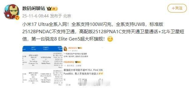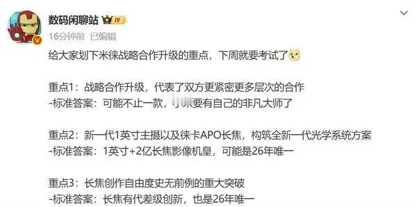 【曝小米17 Ultra会有自己的“非凡大师” 创造两个26年唯一】小米手机正式官宣小米17 Ultra下周见,并且小米与徕卡全球影像战略合作升级,引入战略共创模式,携手重构移动影像体验。小米17 Ultra将会带来划时代的光学系统方案,以及移动影像领域首款徕卡APO认证长焦镜头,实现移动影像长焦创作的颠覆性体验革新。在官方消息之外,知名数码博主数码闲聊站也曝光了更多消息,可以说是此次小米新品非常值得期待。一方面是战略合作升级,代表了双方更紧密更多层次的合作,可能不止一款新品,小米要有自己的非凡大师了。都知道,非凡大师作为华为Mate系列的高端品牌,在市场上备受追捧,而随着小米在高端市场的声量越来越大,打造一款属于自己的非凡大师也是破局所需;另一方面是小米17 Ultra会搭载新一代1英寸主摄以及徕卡APO长焦,构筑全新一代光学系统方案,1英寸+2亿长焦影像机皇,可能是26年唯一;最后一方面是长焦创作自由度史无前例重大突破,长焦有代差级创新,也是26年唯一。今年的小米17系列拥有着非常高的市场关注度,销量也是一路飙升,借着更早的上市节奏,基本可以确定是今年下半年国产旗舰的销量领头羊。而如今小米17 Ultra超大杯产品在时间上相较于各家又领先一个身位,这也将再次叠加时间buff,配合上全新的光学系统和更强的产品力,很有可能会再次拉高小米产品的均价和小米品牌在高端市场的价值。