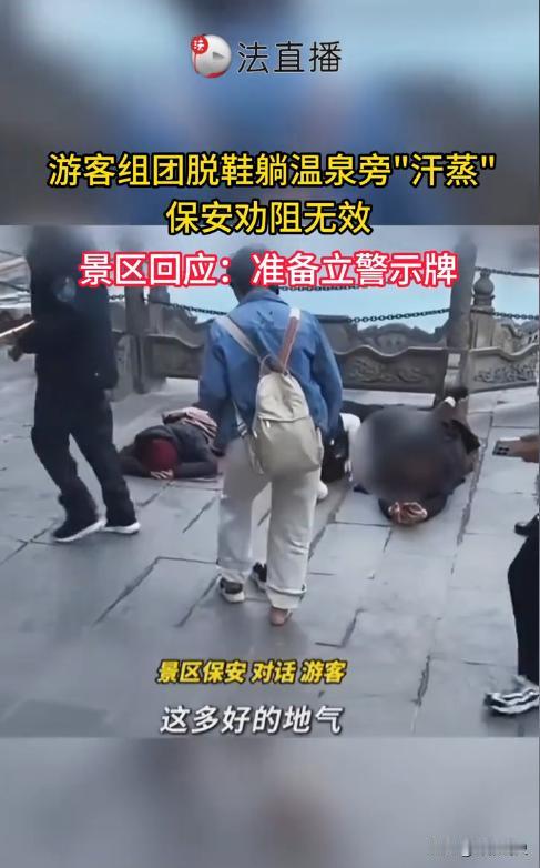 “活不起了?”12月14日,云南腾冲,一群大妈在热海景区游玩时,发现温泉附近非常暖和,直接脱了鞋躺在地上做“汗蒸”!保安发现后急忙过来劝阻,可大妈非但不听劝,还推搡保安嫌他多管闲事。[思考] 那个冬日午后,腾冲热海风景区雾气氤氲,温泉池旁热气蒸腾的地面上,几位大妈脱去鞋袜,坦然躺卧,她们身下垫着自带的小毯子,将公共步道变成了私家“理疗床”。 这番景象让过往游客纷纷侧目,有人举起手机,记录下这令人错愕的一幕。 保安人员迅速赶来劝阻,却遭遇了不小的阻力,据景区工作人员事后描述,部分游客情绪激动,不仅对劝阻置若罔闻,甚至出现了推搡行为。 景区管理者感到十分无奈,他们并非执法机构,面对此类情况,除了反复劝导,缺乏更有效的制约手段。 腾冲热海因火山地热资源闻名,地面温热本是自然现象,却意外“开发”出这种另类用法,然而这种行为直接侵占了公共通道,影响他人正常游览。 随着旅游市场复苏,从景区刻字到违规投喂,各类不文明行为时有发生。每一次类似事件曝光,都会引发公共空间规则与个人行为自由的讨论。 景区管理方在优化服务与提示的同时,或许也需要思考更多柔性与刚性结合的管理智慧。 这事儿在网上传开之后,评论区可真是炸开了锅,网友们七嘴八舌,说什么的都有,简直比事件本身还热闹。 “这要是有人有脚臭,周围的人不得遭老罪了!” “我看着都跟着脸红,毕竟是景区,来往的还有外地人、外国人,这观感确实不太好。” “公共场合脱鞋躺地,太没素质了,开心也得守规矩、顾别人感受,不能把公共区域当自家炕头。” 大妈们可能没太多坏心思,就是觉得“地气好,暖和养生”,一时没想那么多。 “旅游体验好不好,很多时候不取决于风景,而取决于你身边的人怎么用这块地方,一次随意,很可能让别人败兴而归。” “不是执法部门,只能劝导,没什么好办法”,从“泡脚大军”到“躺平一族”,公共空间的文明边界到底在哪?光靠立警示牌是不是真的管用? 如果你在现场看到这一幕,除了拍照或者摇头,你觉得怎么做或者景区采取什么措施,才能更有效地化解这种尴尬又恼火的局面呢?欢迎在评论区分享你的高见! 信息来源:荆楚网