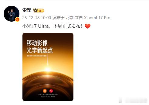 雷军官宣:小米17 Ultra下周正式发布12月18日,雷军在微博发文宣布,小米17 Ultra将于下周正式发布。小米17ultra发布时间定档雷军小米17ultra下周发布