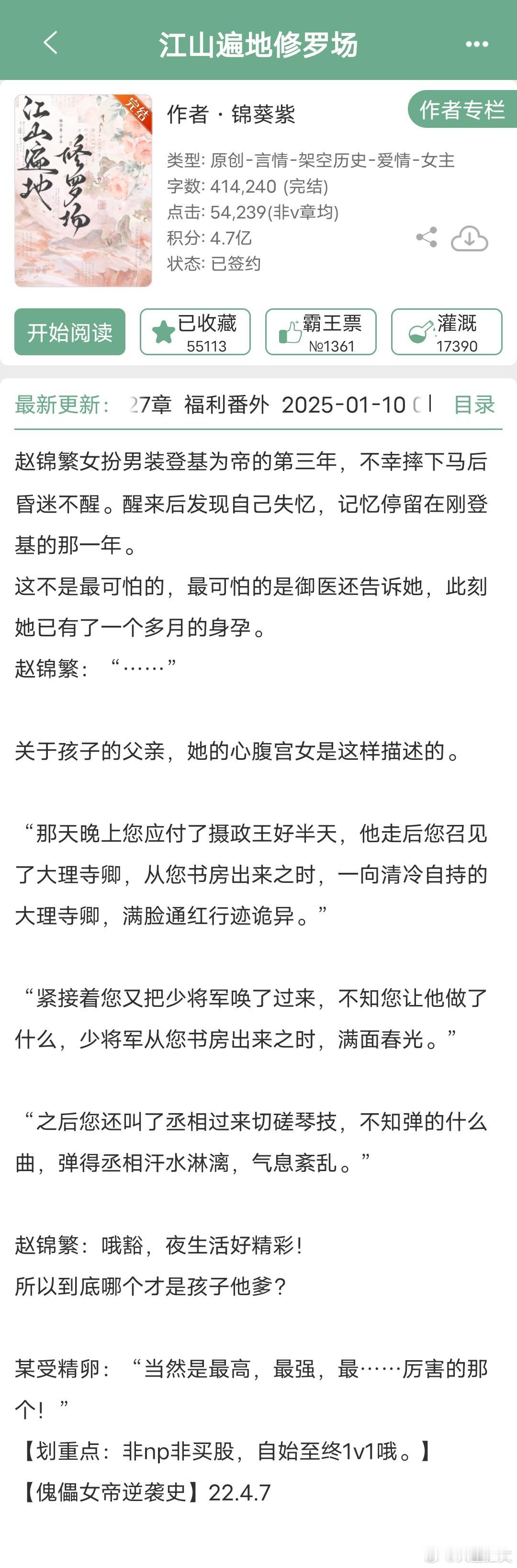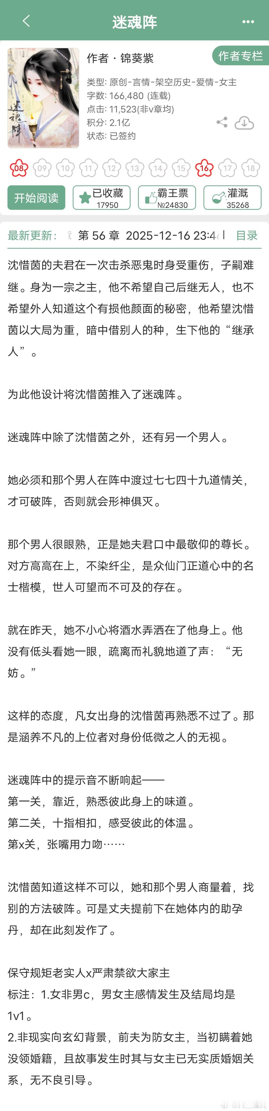 《迷魂阵》锦葵紫作者实在太会写了,梗超级香,玄幻修真背景,女主夫君那方面不行,生不出孩子,就设计把女主推进迷魂阵中借子。男主是被众人敬仰的尊长,高高在上,清冷禁欲。这种梗很考验作者文笔,一个保守规矩老实人,一个严肃禁欲大家主,两人都是隐忍的性格,被迫进入迷魂阵,只有闯过七七四十九道情关才能出来。还是女非男c,挣扎抗拒,隐忍克制,但又互相吸引,拉扯过程很上头。目前还在连载,作者几天更一次,现在才16万字。另一本《江山遍地修罗场》锦葵紫女主女扮男装,非买股文,男主是摄政王女主女扮男装登基,跟男主一夜情后怀孕,摔下马失忆。男主是摄政王,服务意识很好,上得厅堂,下得厨房,很会做菜。推文小说推荐