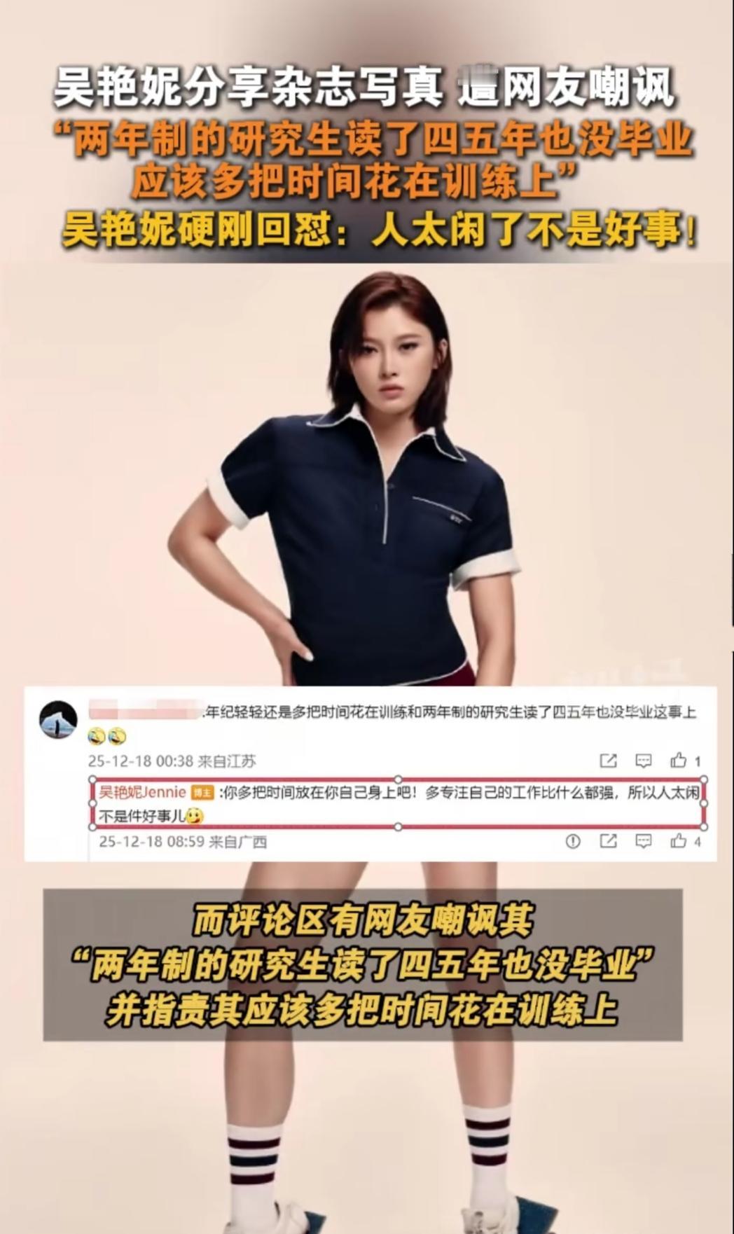 吴艳妮发了组杂志写真,照片里又美又有力量,结果评论区有人跳出来挑刺,说她两年制研究生读了四五年没毕业,就该把心思全放训练上,这话听着就来气。 咱就说,运动员的日子能有多轻松?吴艳妮天天泡在训练场练,还要跑比赛、备赛,能挤时间读研就已经很不容易了。进度慢不是很正常吗?总不能为了训练连书都不读了吧? 她直接回怼“人太闲不是好事”,真的说到点子上了。有些人就是闲着没事干,才盯着别人的生活指手画脚。运动员也不是只有训练这一件事要做,人家也能拍写真、完成学业,凭啥被这么苛责啊?