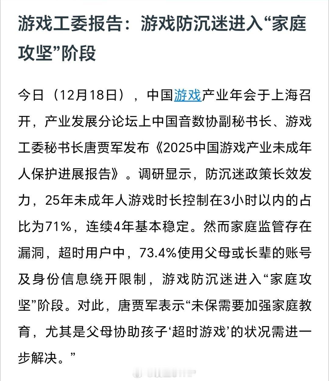 家长缺位成孩子超时游戏主因游戏防沉迷进入“家庭攻坚”阶段 、超7成用长辈账号或身份绕开限制中国音数协副秘书长、游戏工委秘书长唐贾军表示“未保需要加强家庭教育,尤其是父母协助孩子‘超时游戏’的状况需进一步解决。”7成超时孩子用家长信息规避防沉迷