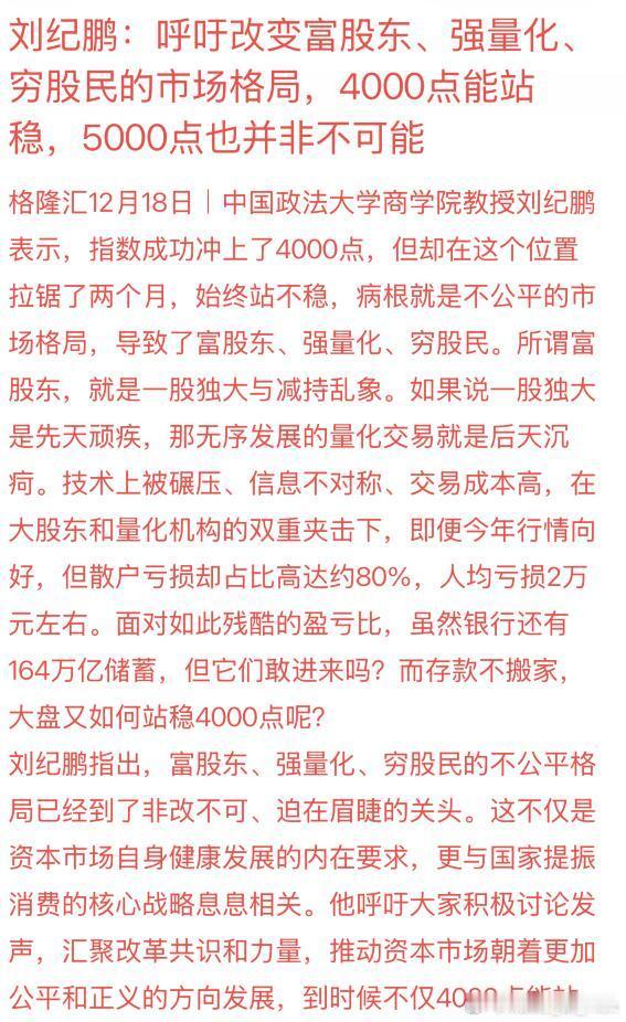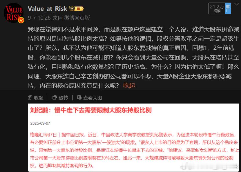 几个问题,1)除了前期需要大量融资的部分新兴行业公司外,全球有几个公司在IPO时是没有实控人,股权极度分散的?2)在股权分置改革前,大股东完全不能交易自己持有的股票,当时A股市场情况如何?另外,在股价严重低估时,除了少数老千股外,就算是垃圾股的大股东也不会选择减持(例如两年前的港股,回购和增持屡创新高),另外业绩前景良好时,股东减持与否并不会改变走势(比如腾讯、大量美股科技股);3)量化最早是在美股诞生,美股的量化多如牛毛,并且也有交易速度优势(欧美量化公司在交易所附近搭设设备的新闻一搜一把),但这些量化改变了市场走势了吗?甚至大量量化也跑不赢指数。4)影响市场长期走势的究竟是大股东和量化的交易行为、散户的亏损比例多寡?还是上市公司的业绩、估值、流动性?5)总拿多少万亿储蓄说事,为何不具体剖析一下巨额储蓄的持有人群构成?PS.想起来之前也点评过他的观点(图2)