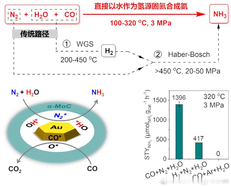 最新科技消息 【我国科学家实现温和条件下以氮气和水为原料直接合成氨】中国科学院大连化学物理研究所今日官宣,能源催化转化全国重点实验室能源与环境小分子催化研究中心(509组群)邓德会研究员、黄瑞研究员、于良研究员团队在合成氨领域取得新进展。团队创新性地提出了“反应耦合”与“双位点协同”相结合的策略,在100至320 °C的温和条件下,实现了以氮气和水为原料直接合成氨,为发展短流程、低能耗的合成氨技术提供了新途径。氨(NH3)是现代农业和化工生产的关键原料。传统Haber-Bosch合成氨工艺依赖高纯氢气作为原料,其制备过程能耗高,且后续纯化步骤复杂。若能将丰富的水资源直接作为氢源,与大气中的氮气反应,将有望从源头缩短合成氨的流程,从而大幅降低能耗和成本。然而,该反应面临两大核心挑战:一是氮气与水直接反应在热力学上极为不利(ΔG >> 0),需要输入极高能量才能发生;二是反应体系中的水分子及含氧中间体会强烈竞争催化剂的活性位点,抑制氮气的吸附与活化,导致反应动力学过程受阻。邓德会团队长期致力于能源与环境小分子的催化转化研究,前期在氮气、水等惰性小分子催化转化方面取得了系列进展(Nat. Catal.,2023;Nat. Catal.,2023;Nat. Synth.,2023;Nat. Catal.,2021;Nat. Commun.,2021;Nat. Commun.,2019)。本工作针对上述挑战,提出了系统性的解决方案。在热力学层面,团队创新性地引入一氧化碳(CO)调变热力学,利用其与水中氧原子反应的强放热,将原本强吸热的反应转变为热力学有利反应,从而绕开氮气与水反应的热力学限制。在动力学层面,团队设计并构建了Au/α-MoC1-x双位点催化剂,其界面钼(Mo)位点负责吸附活化氮气(N2)和水(H2O)生成氨,界面金(Au)位点则吸附CO作为“氧受体”移除残余氧,二者协同实现了氮气活化、水分解、加氢与氧移除等多个步骤的相互拉动与催化循环。该“反应耦合”与“双位点协同”相结合的策略使得原本不可行的反应在100 °C的低温下即可启动,在320 °C时产氨速率达1396 μmol g-1 h-1,其性能较相同条件下利用氢气作为氢源的体系高出2倍以上。该工作不仅证实了温和反应条件下氮气和水直接合成氨的可行性,更在原理上为开发其他直接用水作为氢源的高效催化加氢过程提供了借鉴。相关研究成果以“Direct Ammonia Synthesis from Nitrogen and Water at Mild Conditions”为题,发表在《美国化学会志》(Journal of the American Chemical Society)上,上述工作得到了国家重点研发计划、国家自然科学基金、我所能源催化转化全国重点实验室、我所创新基金等项目的资助。文章链接:网页链接