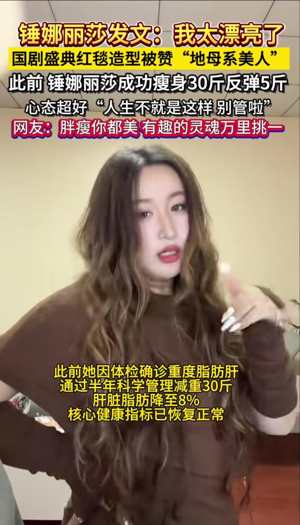 锤娜丽莎真的活成了女生羡慕的样子!国剧盛典红毯造型被夸“地母系美人”,她直接发文“我太漂亮了”,自信的样子超戳人,可谁能想到她刚经历了减肥反弹? 此前她因重度脂肪肝减肥30斤,健康指标全恢复,结果反弹了5斤,换别人可能早焦虑了,她却云淡风轻说“人生不就是这样,别管啦”。这份对身材的松弛感,比瘦下来更难得。 网友都说“胖瘦你都美,有趣的灵魂万里挑一”。是啊,美从来不是只有纤瘦一种模样,锤娜丽莎的自信和乐观,让她不管什么状态都闪闪发光。与其被身材焦虑绑架,不如学学她的心态,接纳自己才是最美的开始!