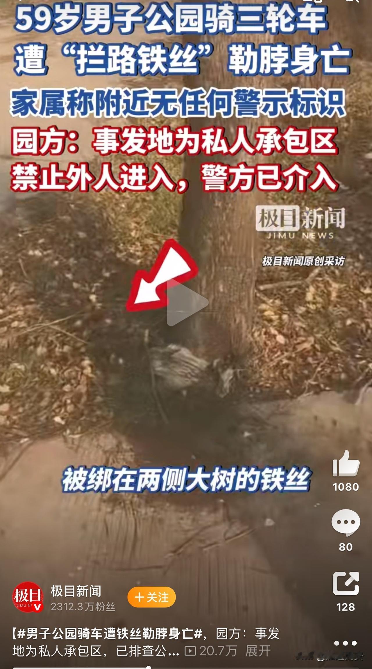 12月17日,一女子发视频称,自己的父亲在公园骑车时,不幸被铁丝割破脖子,送医无效后身亡。而公园负责人称,事发地属于私人承包的,禁止外人进入。目前,警方已介入调查。 12月10日早,她父亲骑三轮车经过首阳山森林公园内一处水泥路面时,被绑于路面两侧大树的铁丝割破脖子,随后紧急送到医院抢救,很不幸没有抢救过来。 女子无法理解为何树上会绑着铁丝,最关键的是,周边没有任何警示标识。 据了解,此公园是一座面积大的开放式公园,经常有自行车、小汽车经过。 事后,公园负责人称事发地是私人承包,现在为一个社会组织的训练基地,以前有篱笆墙拦着,后来慢慢的就有人把篱笆墙上的树枝、木栏杆偷走了,现在只剩一根铁丝,如果当时他们挂一个禁止外人进入的牌子,也许就没事了。 其实这种细铁丝、风筝线对骑车的人来说,真就是隐形杀手,看着软乎乎的,高速撞上就跟刀似的。 这事儿也让我想起了我同学的弟弟,他骑摩托给老丈人送东西,回来的路上被电线杆连接地面的钢丝绳勒脖身亡。 后来有关单位吸取教训,把所有钢丝绳都被包裹并且像护栏一样一节一节醒目的红白色。 我同学家只有姐弟俩,弟弟没了,孩子一两岁,她妈妈跟弟媳妇家结仇,怨恨如果不是弟媳妇让给老丈人送动作也不会发生这样的事。 最后也希望相关部门能查清楚,给逝者家属一个公道,也赶紧把这些隐藏的安全隐患都清干净。