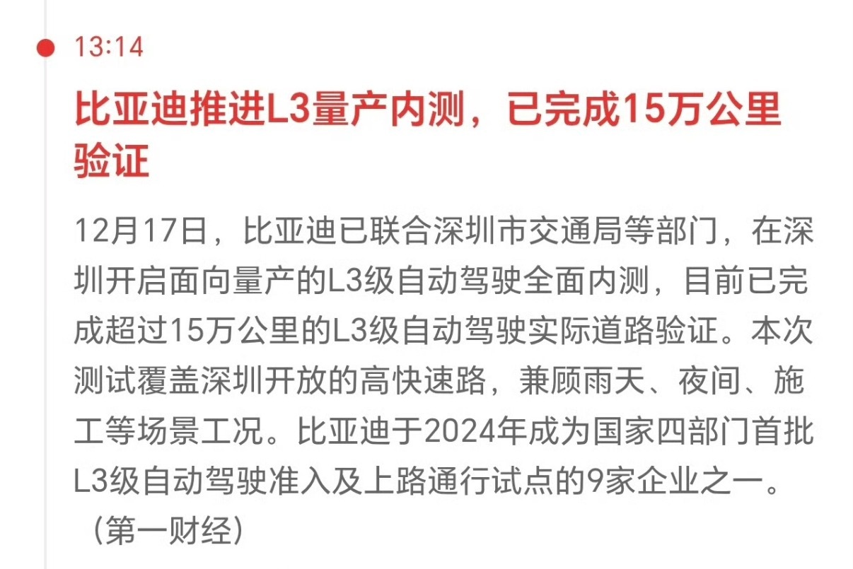 很多人一听 L3 就兴奋,但真正难的是把系统放进真实交通里反复打磨,无论任何环境天气都要覆盖上,比如雨天、夜间、施工路段、高快速路都要能用且用得好,这些场景全覆盖,本质是在做一件事:把不确定性压到最低。我的判断有三点: ① 15 万公里不是炫数据,而是量产前的“耐心测试”。L3 拼的不是激进,而是稳定。 ② 和交通管理部门联合推进,说明路线是“合规先行”,不是先卖再补。 ③ 中国品牌在自动驾驶上,正在从“功能展示”转向“责任落地”,这是分水岭。自动驾驶真正的价值,不是解放双手,而是把安全边界一寸寸往前推。比亚迪推进自动驾驶内测这一步不吵,但很重。真正能走远的技术,往往就是这样一步一步脚踏实地走出来的。