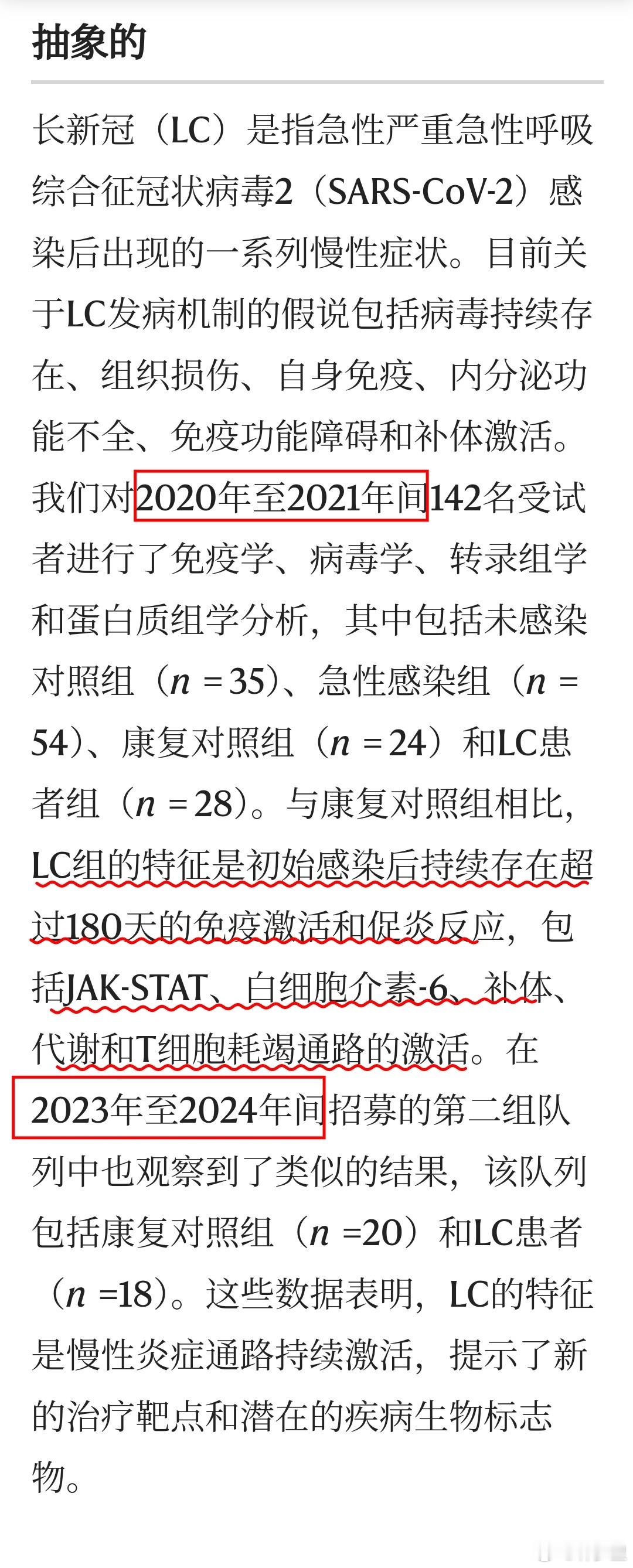 长新冠涉及促炎和免疫耗竭通路的激活。这个研究特别之处是,对比了2020年~2021年,与2023~2024年新冠毒株感染后,长新冠的特征。✨2020-2021 年队列样本,于 2020 年 4 月至 2021 年 10 月期间采集。✨2023-2024 年验证队列样本于 2022 年 10 月至 2024 年 12 月期间收集。这些年份,基本覆盖了新冠原始株、德尔塔等,以及2022年的奥密克戎,与之后的毒株。当年的一个话术,声称奥密克戎毒性降低了,奥密克戎不是原始株,所以没有后遗症,或者不严重。而,这个研究则发现:早年的新冠毒株与奥密克戎及之后的毒株,长新冠特征具有一致性。✨即:LC的特征是慢性炎症、免疫耗竭和代谢紊乱。✨新冠感染后,持续存在超过180天的免疫激活和促炎反应,包括JAK-STAT、白细胞介素-6、补体、代谢和T细胞耗竭通路的激活。✨在2023年至2024年间招募的第二组队列中,也就是奥密克戎及之后的毒株中,也观察到了类似的结果。参考:网页链接