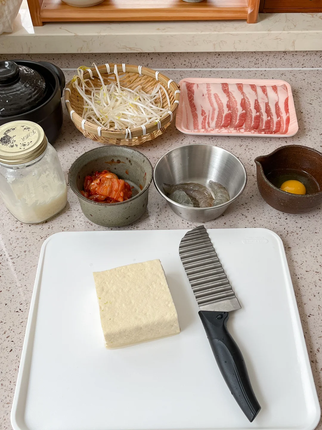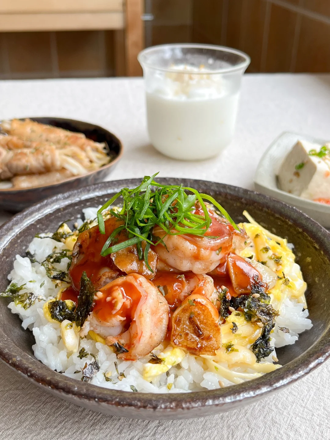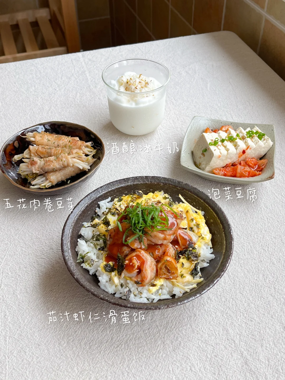 今日午餐: 茄汁虾仁滑蛋饭🍤 泡菜豆腐🫘 五花肉卷豆芽🌱 酒酿冰牛奶🥛 今天在做滑蛋的时候 撕了点白玉菇进去 这个搭配的我还挺惊喜的 不怕塞牙的话 用金针菇可能更好吃 用做狼牙土豆的刀切豆腐 感觉豆腐一下子都变得高级了 新鲜的卤水豆腐就适合直接吃 热乎乎的 夹上一点泡菜或肉酱就足够