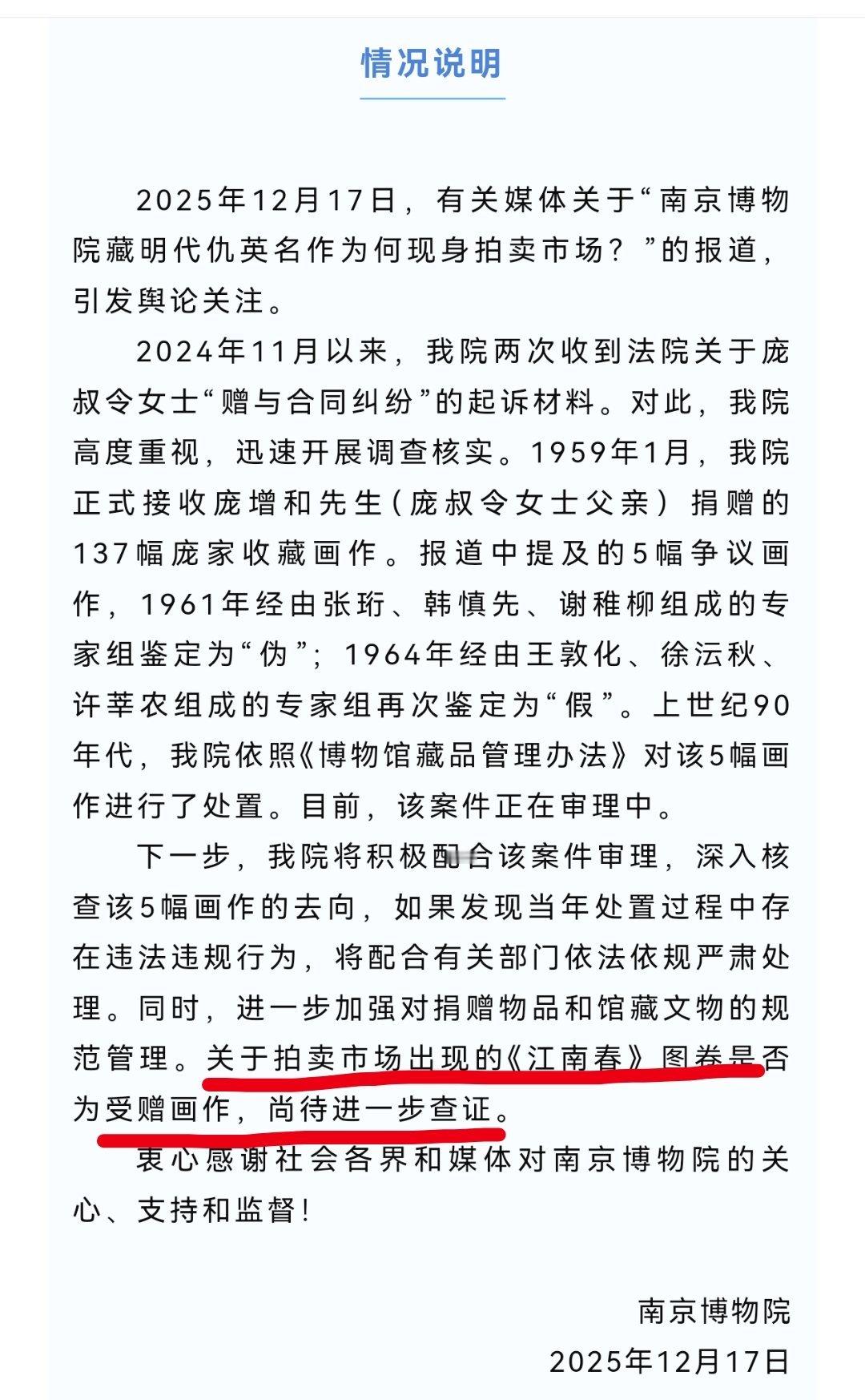 南京博物院的声明中称拍卖市场中出现的《江南春》图卷是否是捐赠的画作,还需要进一步查证。这个查证很容易啊,此前就有报道称,“《江南春》卷经明清两代收藏大家,今天在手卷上可以清楚看到,上面盖有收藏大家王任堂、顾文彬、王鲲、庞莱臣等60多方印鉴……”,查查这些印鉴就知道了。文物保护法规定“文物收藏单位应当建立馆藏文物的接收、鉴定、登记、编目和档案制度,库房管理制度,出入库、注销和统计制度,保养、修复和复制制度。”即便真如南京博物馆所说是“假画”,那么相关处置也应该有详细的记录和明确的流向,在“高度重视”和“迅速调查核查”之下,一年多的时间,只给出“将积极配合案件审理,深入核查画作去向”的回应未免把公众当傻子了。而且即便真是“假画”,那就没有价值了吗?很多画作的仿品仍然具有很高的艺术、历史和经济价值,南京博物院既然认为相关画作不具备收藏的价值,那就应该第一时间联系捐赠人退还,而非是让捐赠人的后人只能通过诉讼的方式才能得知5幅画作的神秘失踪。庞莱臣赠送藏品去哪儿了文旅厅回应南博藏品现身拍卖