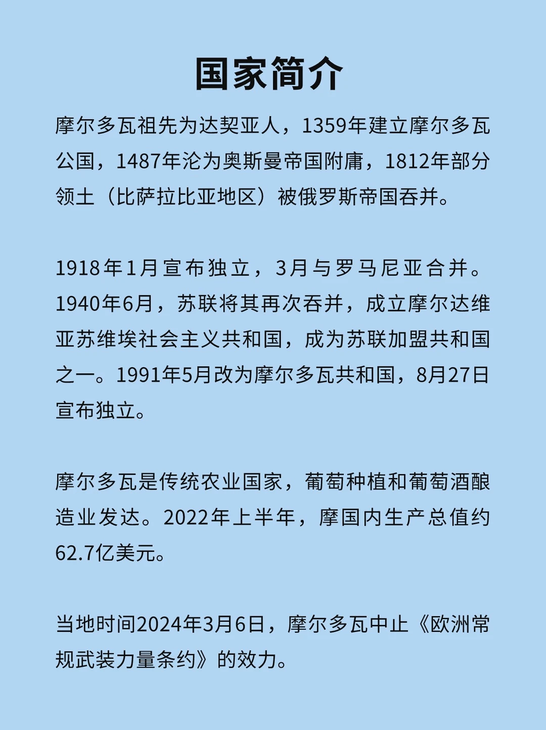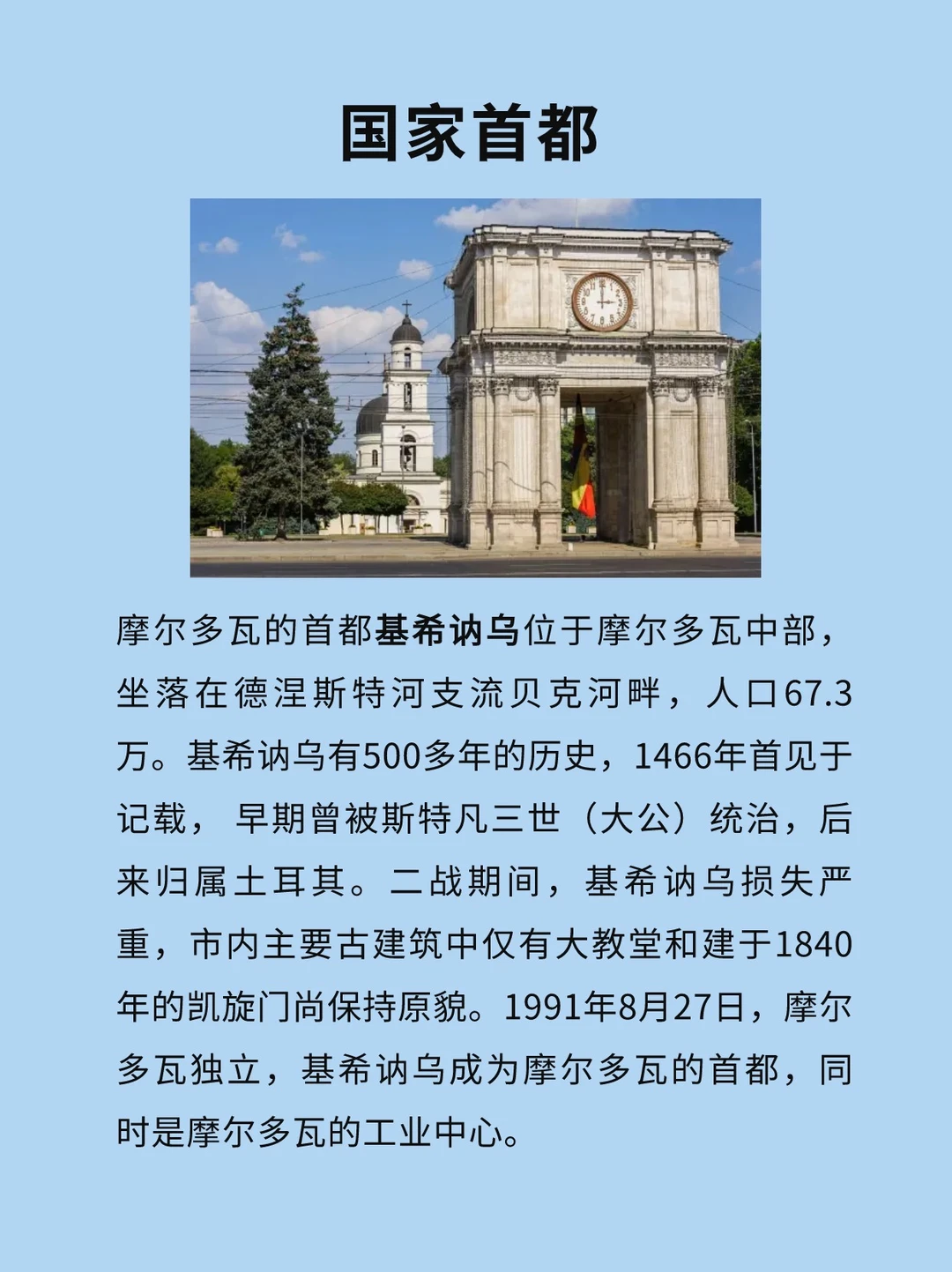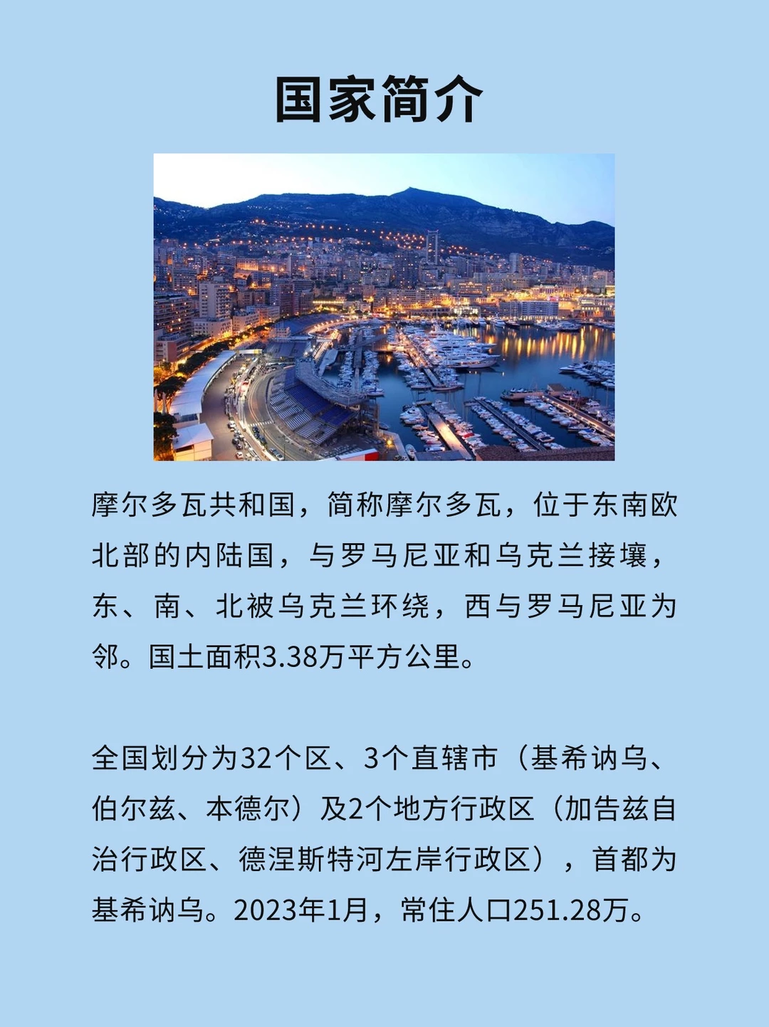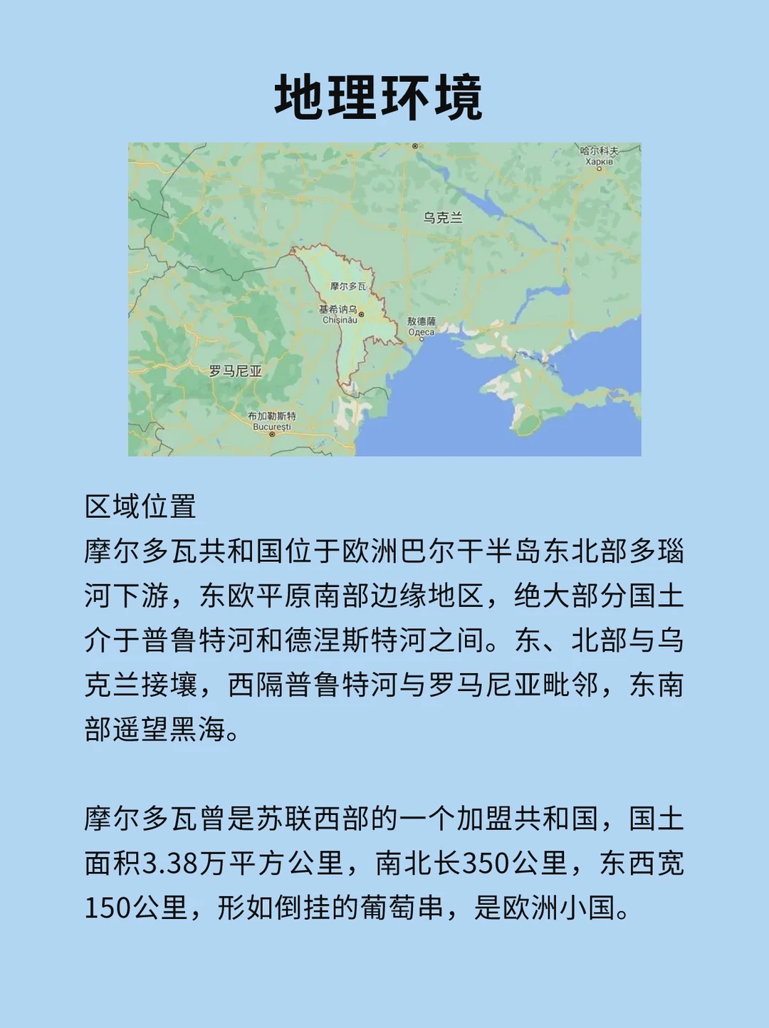 [打卡R]摩尔多瓦共和国,简称摩尔多瓦,位于东南欧北部的内陆国,与罗马尼亚和乌克兰接壤,东、南、北被乌克兰环绕,西与罗马尼亚为邻。 [彩虹R]国土面积3.38万平方公里。全国划分为32个区、3个直辖市(基希讷乌、伯尔兹、本德尔)及2个地方行政区(加告兹自治行政区、德涅斯特河左岸行政区),首都为基希讷乌。2023年1月,常住人口251.28万。
