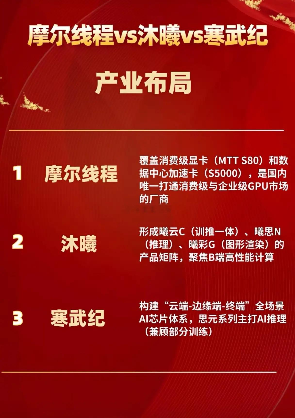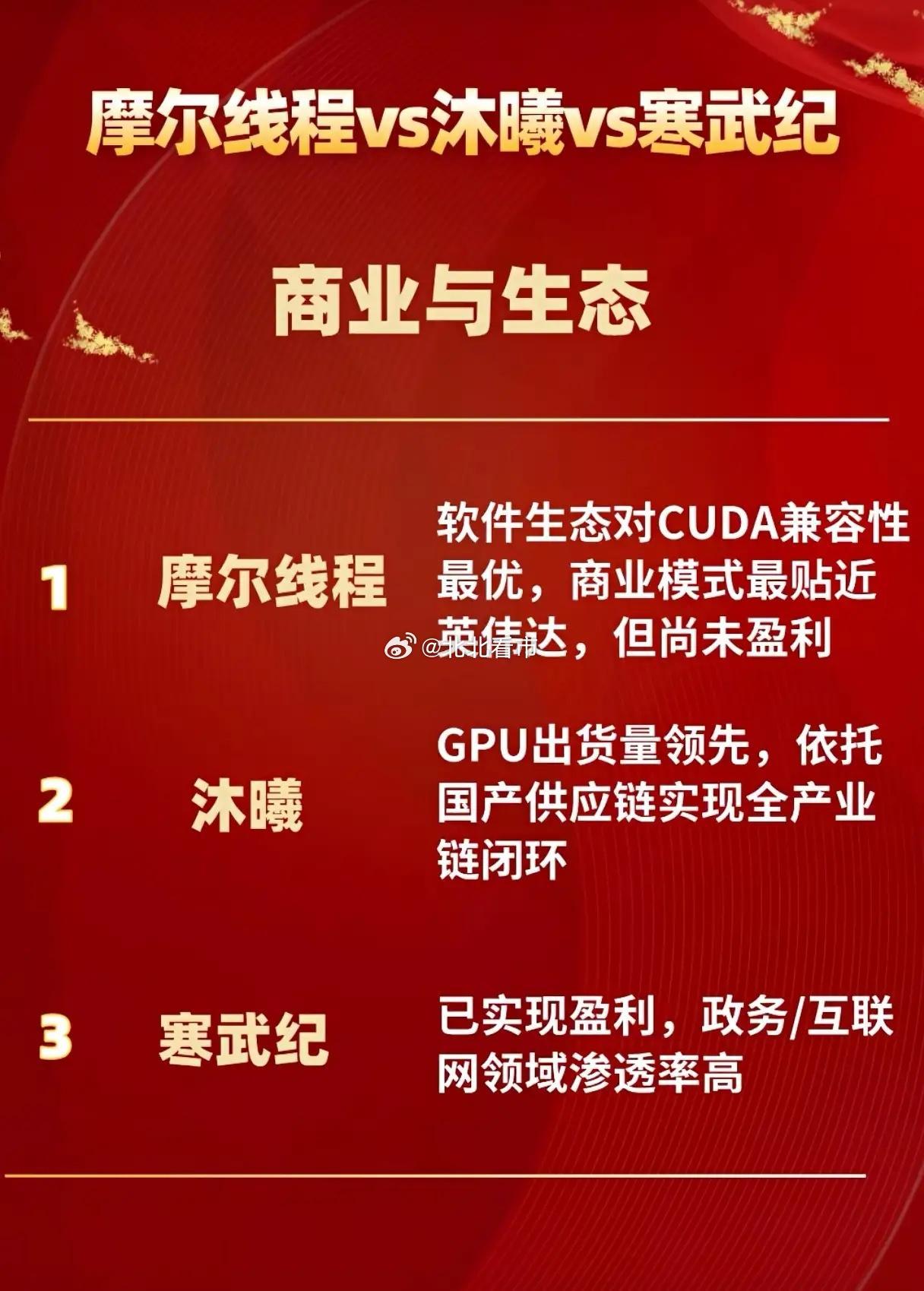 国产算力芯片三强争霸,差异化布局如何改写市场格局?当摩尔线程、沐曦、寒武纪在国产算力芯片赛道形成三足鼎立,三者从技术路线到产业布局的差异化选择,不仅打破了海外企业的垄断,更构建起“全场景GPU+高性能GPU+AI专用ASIC”的互补格局,推动国产AI算力从“单点可用”迈向“全场景适配”,预计2027年国产替代率将超80%。技术路线的差异化是三强竞争的核心底色,摩尔线程主打全功能GPU,成为国内唯一打通消费级与企业级GPU市场的厂商,MTT S80消费级显卡与S5000数据中心加速卡覆盖全场景需求;沐曦聚焦高性能通用GPU,曦云C、曦思N等产品矩阵专攻AI训练的B端高性能计算,算力性能对标海外中端GPU;寒武纪则深耕AI专用ASIC,思元系列芯片在AI推理场景的能效比优势显著,构建起“云端-边缘端-终端”的全场景AI芯片体系。产业布局的侧重让三强各占赛道优势,摩尔线程的消费级+企业级双赛道布局,填补了国产消费级GPU的空白,在电竞、桌面计算领域实现突破;沐曦的B端高性能计算产品矩阵,精准切中AI大模型训练、智算中心的算力需求,GPU出货量位居国产厂商前列;寒武纪的全场景AI芯片体系,在政务、互联网领域的渗透率超30%,成为AI推理场景的核心供应商。商业与生态的发展则呈现不同节奏,摩尔线程的软件生态对CUDA兼容性最优,商业模式贴近英伟达,虽尚未盈利但生态优势显著;沐曦依托国产供应链实现全产业链闭环,GPU出货量领先让其商业化落地速度更快;寒武纪已实现盈利,在政务与互联网领域的深度渗透,成为国产算力芯片企业盈利的标杆。国产算力芯片的发展已从技术跟跑转向差异化领跑,摩尔线程的全场景覆盖、沐曦的高性能突破、寒武纪的专用化优势,共同构成了国产算力的核心竞争力。随着AI算力需求的爆发,三者的差异化布局将持续推动国产算力芯片的替代进程,也让中国在全球算力竞争中占据重要一席。